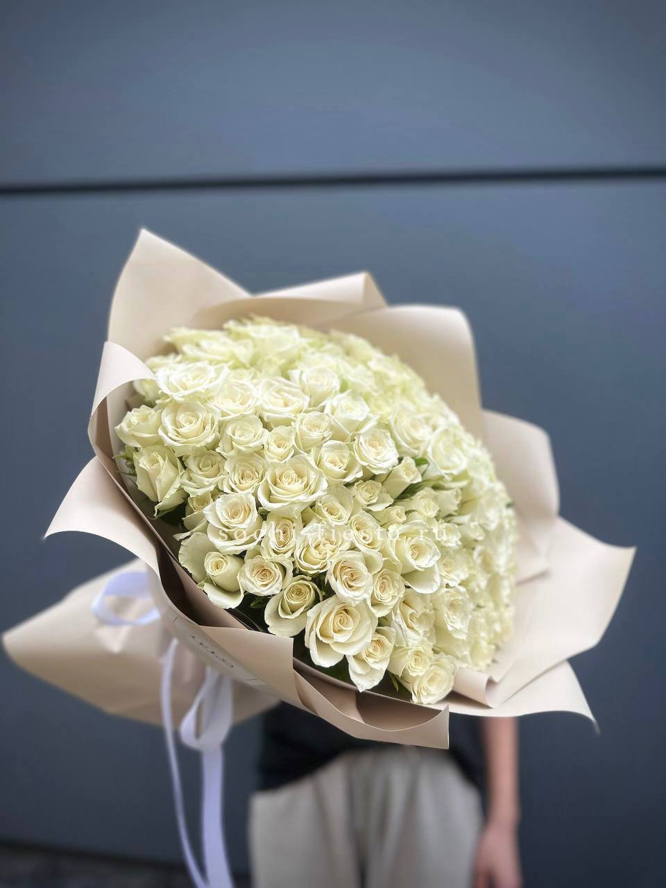 101 белая роза, лента, упаковка на выбор.