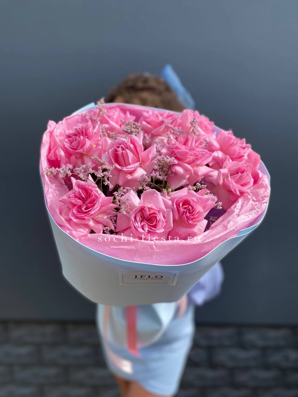 Французские розы распускаются мягкими облаками пудрового оттенка. Лимониум добавляет воздушности, а эвкалипт создает свежую основу. Букет собран так, что каждый бутон виден и дышит.