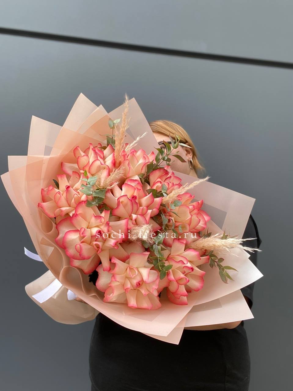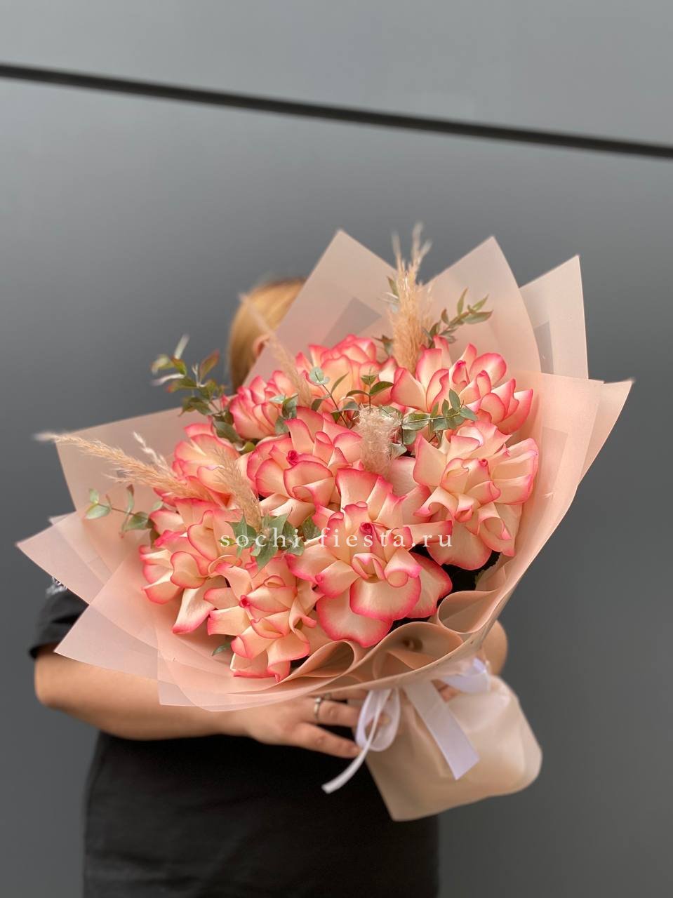 французские розовые розы., лимониум, эвкалипт, лента, дизайнерская пленка. На фото представлен букет из 11 роз.
