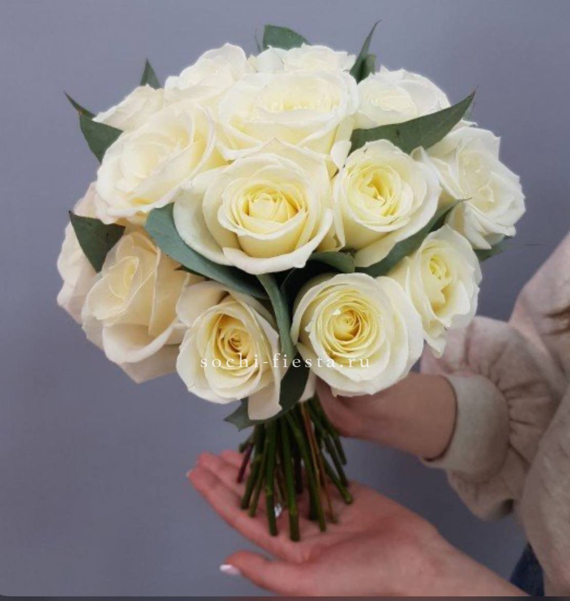 белые розы с эвкалиптом в боксе 16.