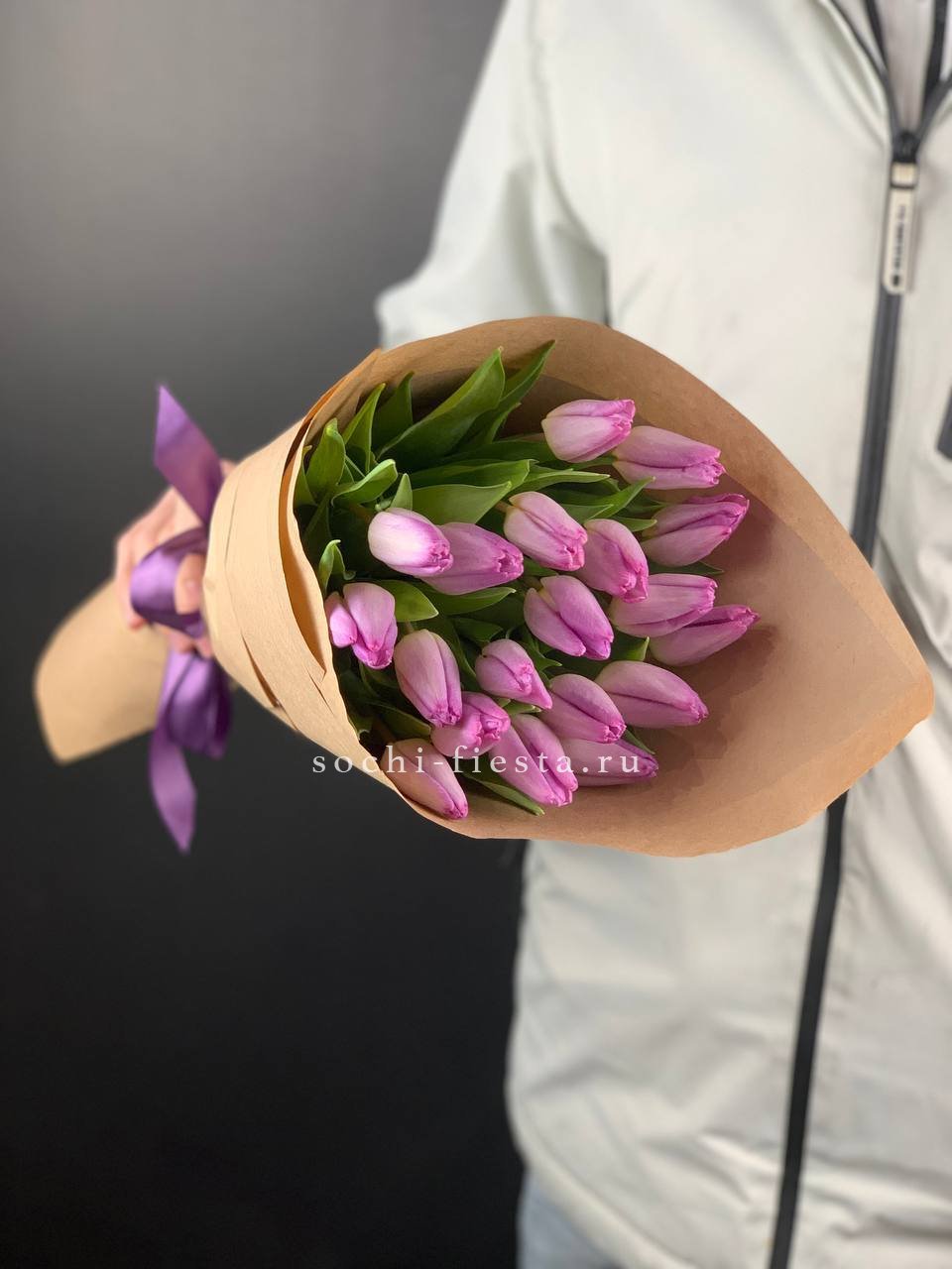 Розовые тюльпаны собраны в свободный букет и завёрнуты в крафт. Тёплый оттенок лепестков наполняет пространство мягким светом. Простая упаковка не отвлекает от природной красоты цветов.