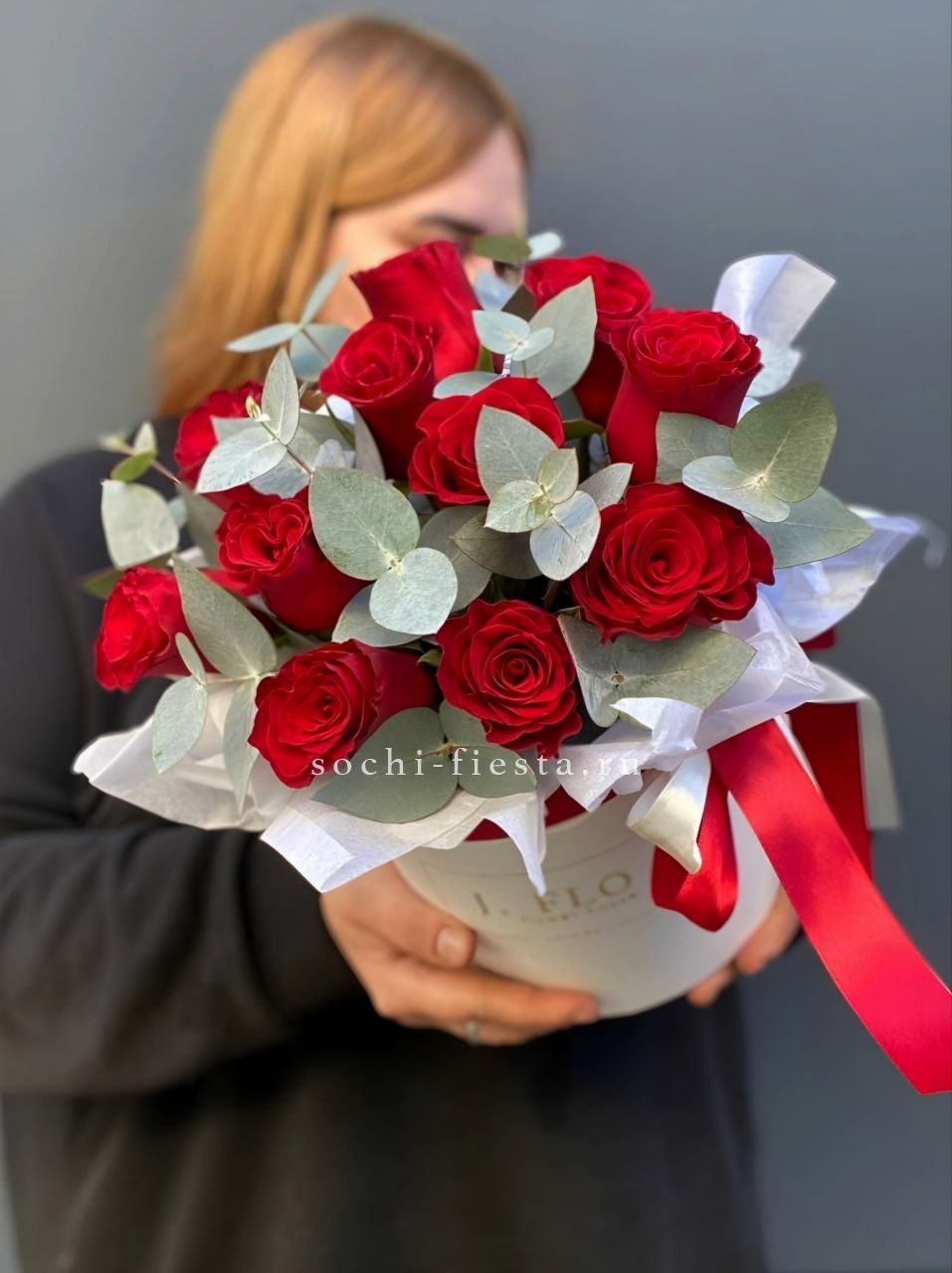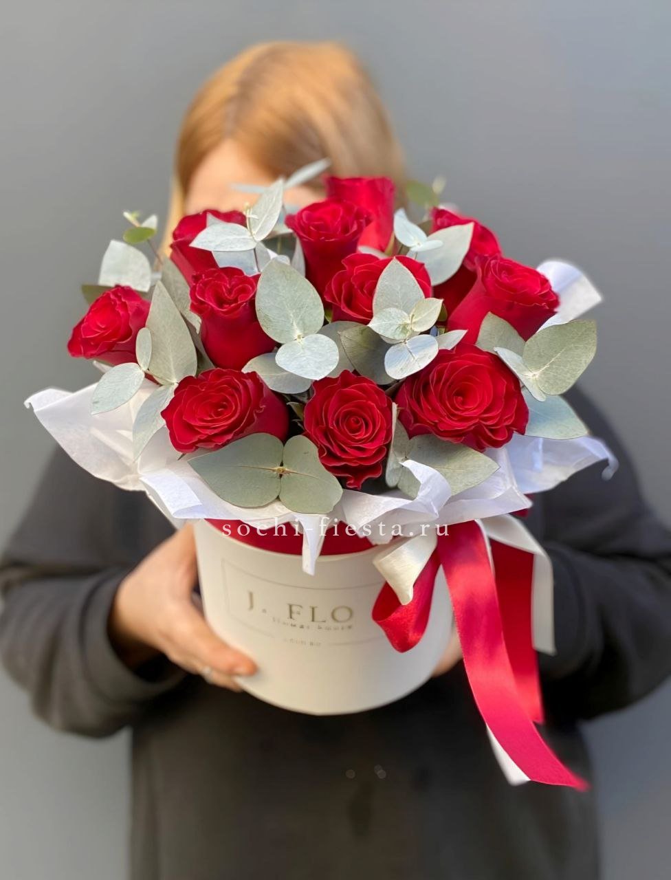 Тридцать девять роз в цилиндре выстраиваются в чёткую геометрию красного и белого. Плотная сборка на оазисе держит форму и создаёт графичное цветовое решение.
