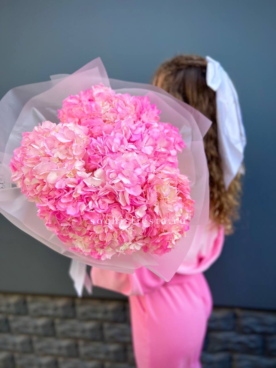 Семь крупных соцветий насыщенного розового оттенка собраны в плотный букет с выразительным силуэтом. Каждая гортензия раскрывает объёмную шапку лепестков, создавая впечатляющее присутствие в любом пространстве.