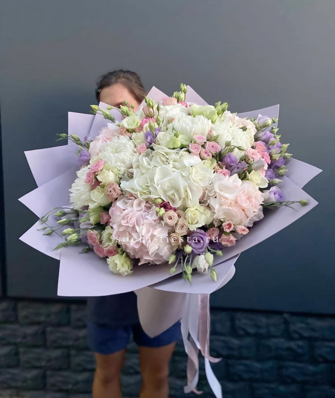 Пышная композиция с насыщенным цветением и многослойной глубиной. Пионовидные формы переплетаются с воздушной эустомой, создавая объём и плавный переход от центра к краям. Каждый бутон раскрыт по-своему.