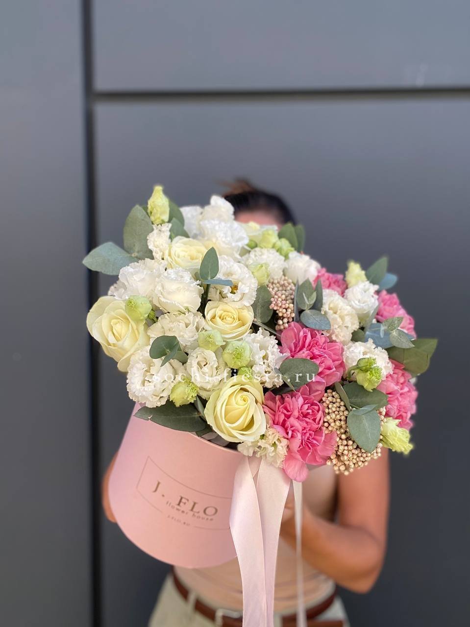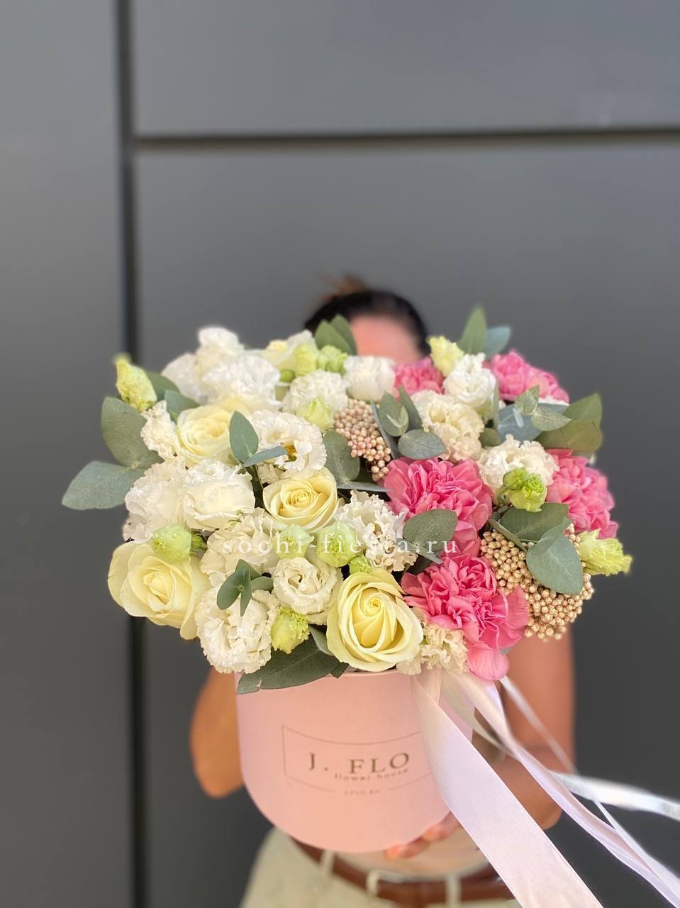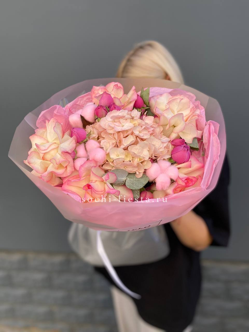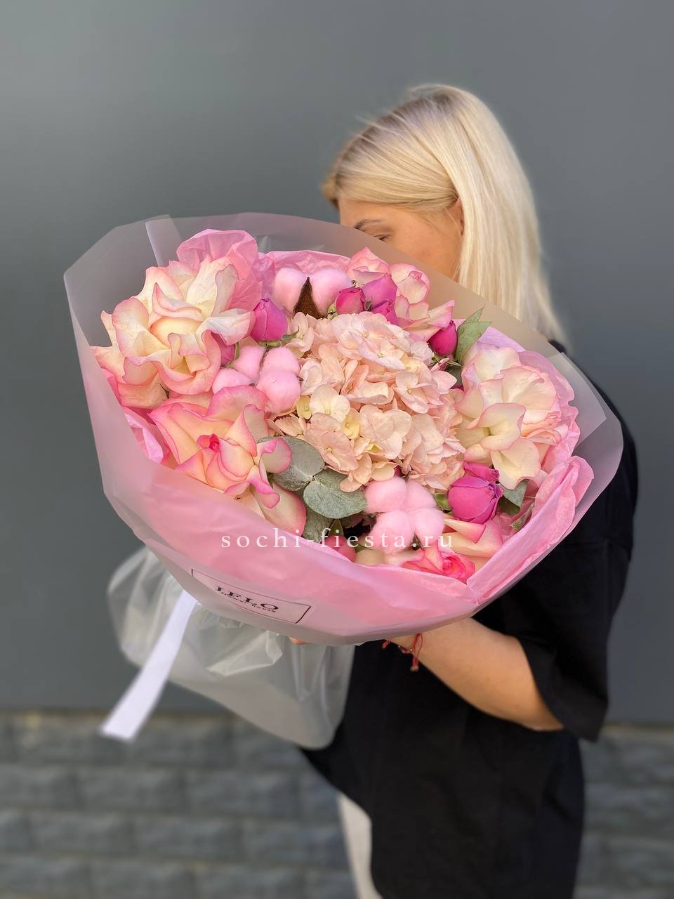 гортензия, вывернутые розы, диантус, кустовая роза, диантусы, оформление в боксе.