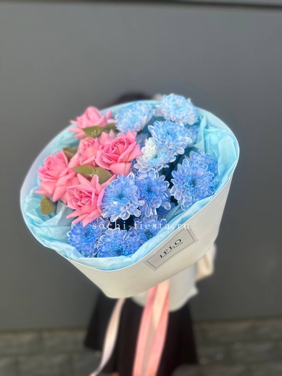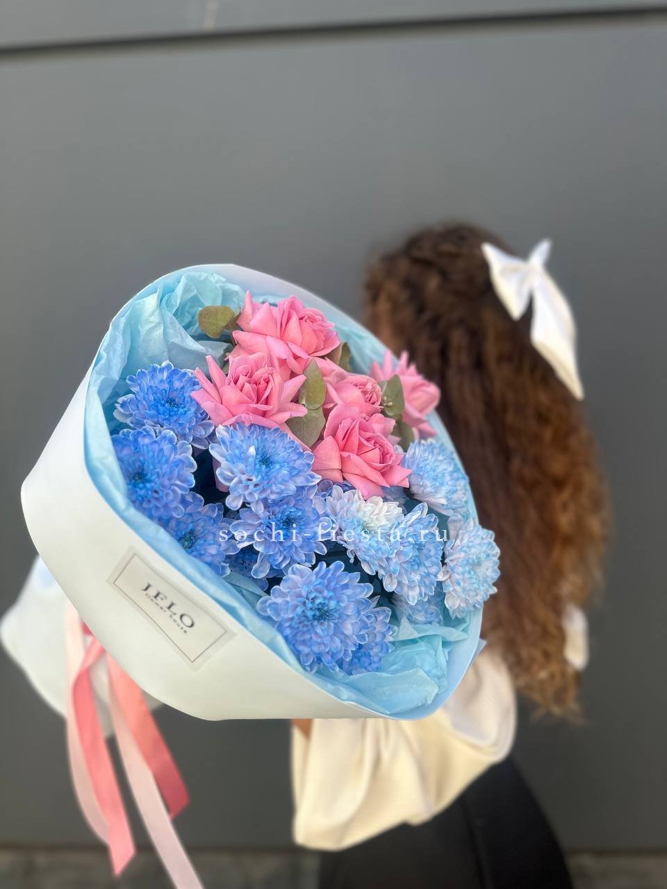 Крупные шапки гортензии встречаются с яркими кустовыми розами бомбастик и образуют насыщенную композицию с выраженным силуэтом. Ветки эвкалипта добавляют графичность и завершают авторскую подачу.