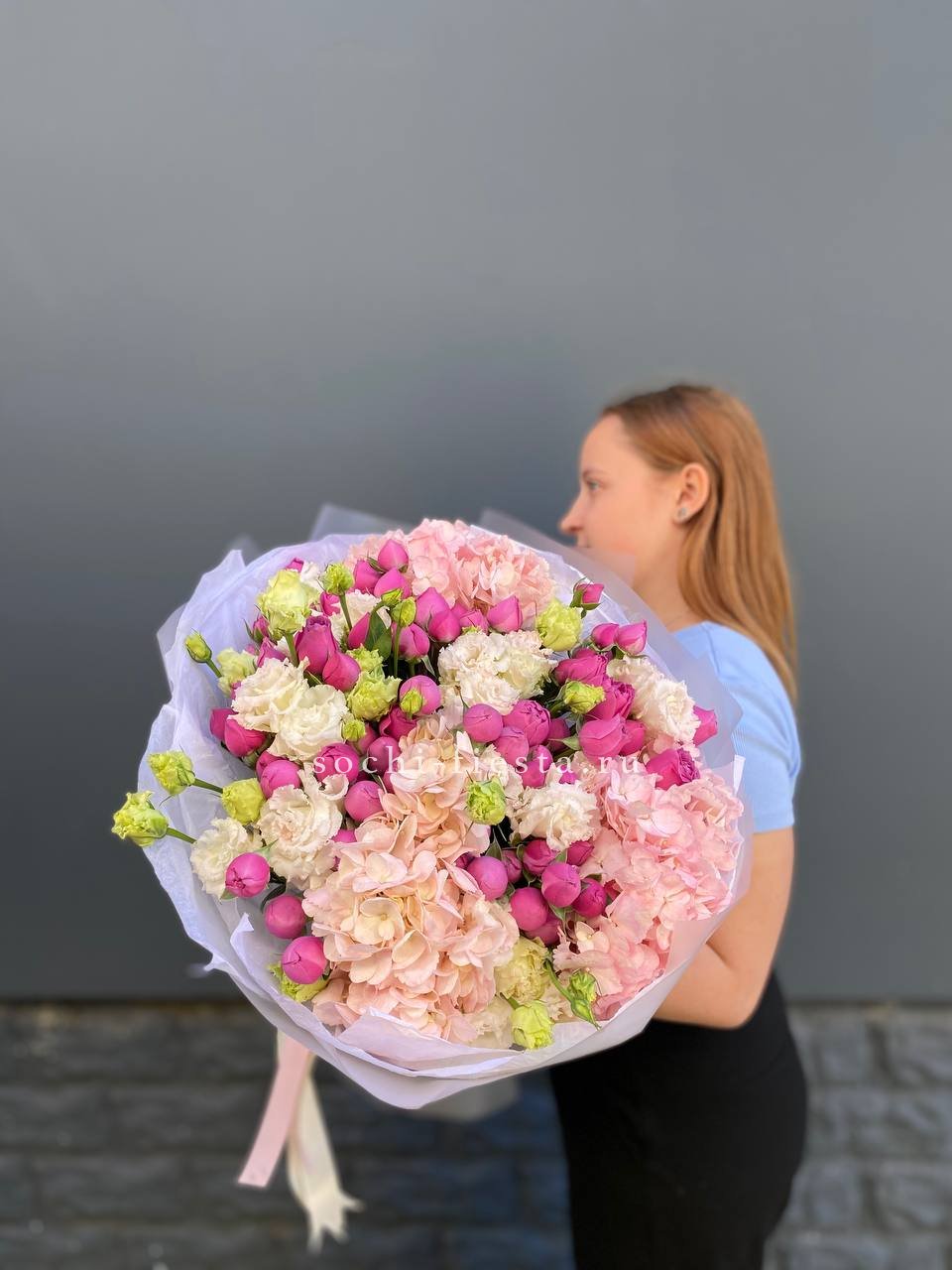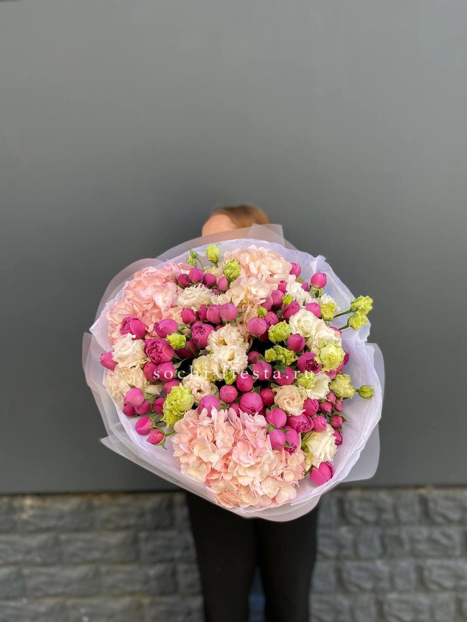 Мисти Баблс и гортензии в воздушной упаковке дарят ощущение свежести раннего утра. Лёгкая структура букета сохраняет форму и долго радует глаз.