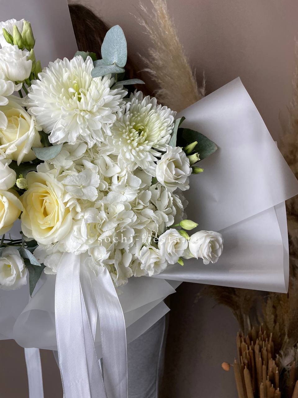 Семь соцветий гортензии раскрываются воздушным облаком с мягкими переходами оттенков. Букет дарит ощущение лёгкости и свежести летнего сада в любое время года.