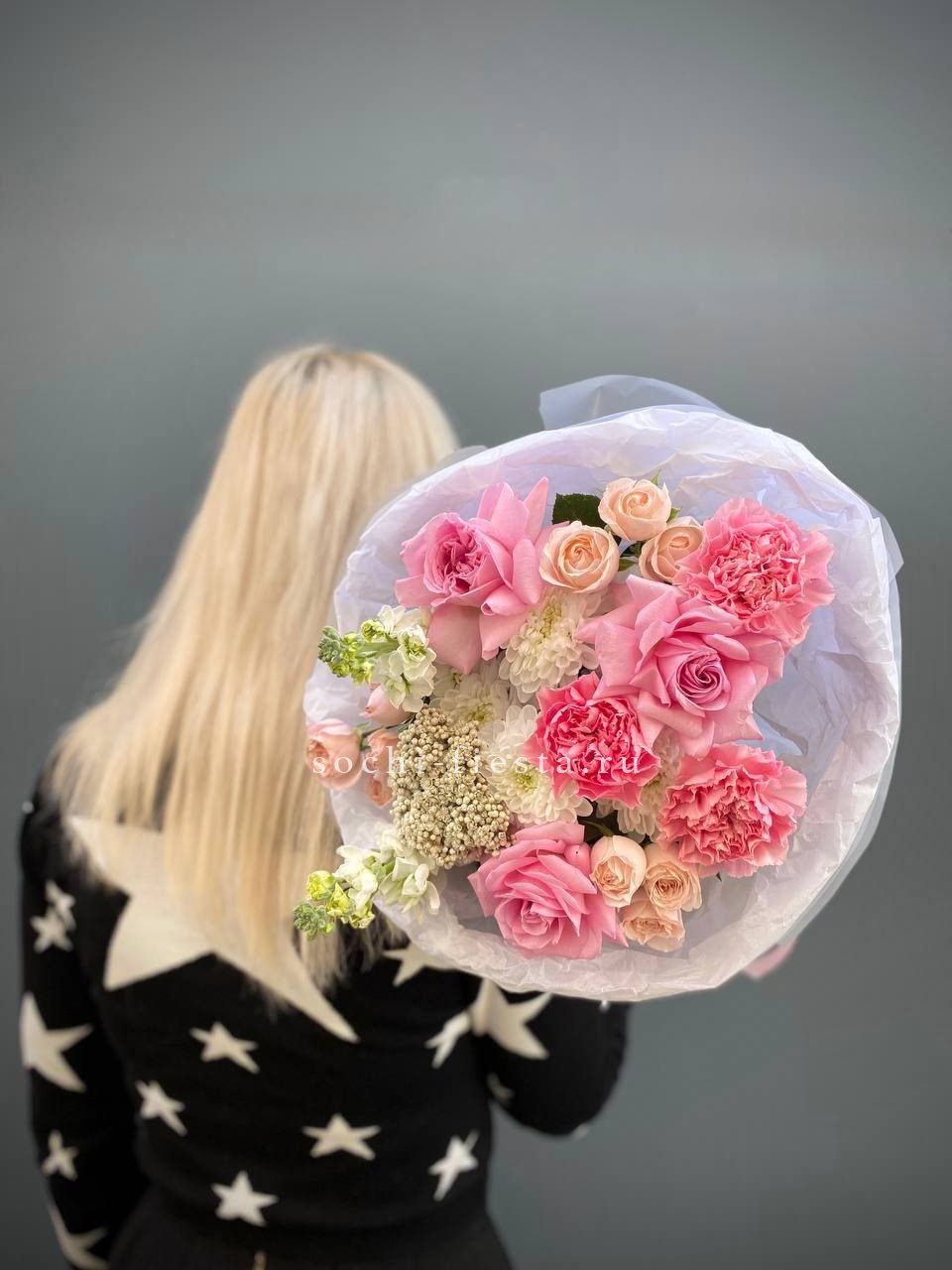 букет из нежных стойких цветов диантусов, роз, хризантем, маттиолы(возможна замена на эустому), озатамуса, бомбастика в воздушном оформлении.
