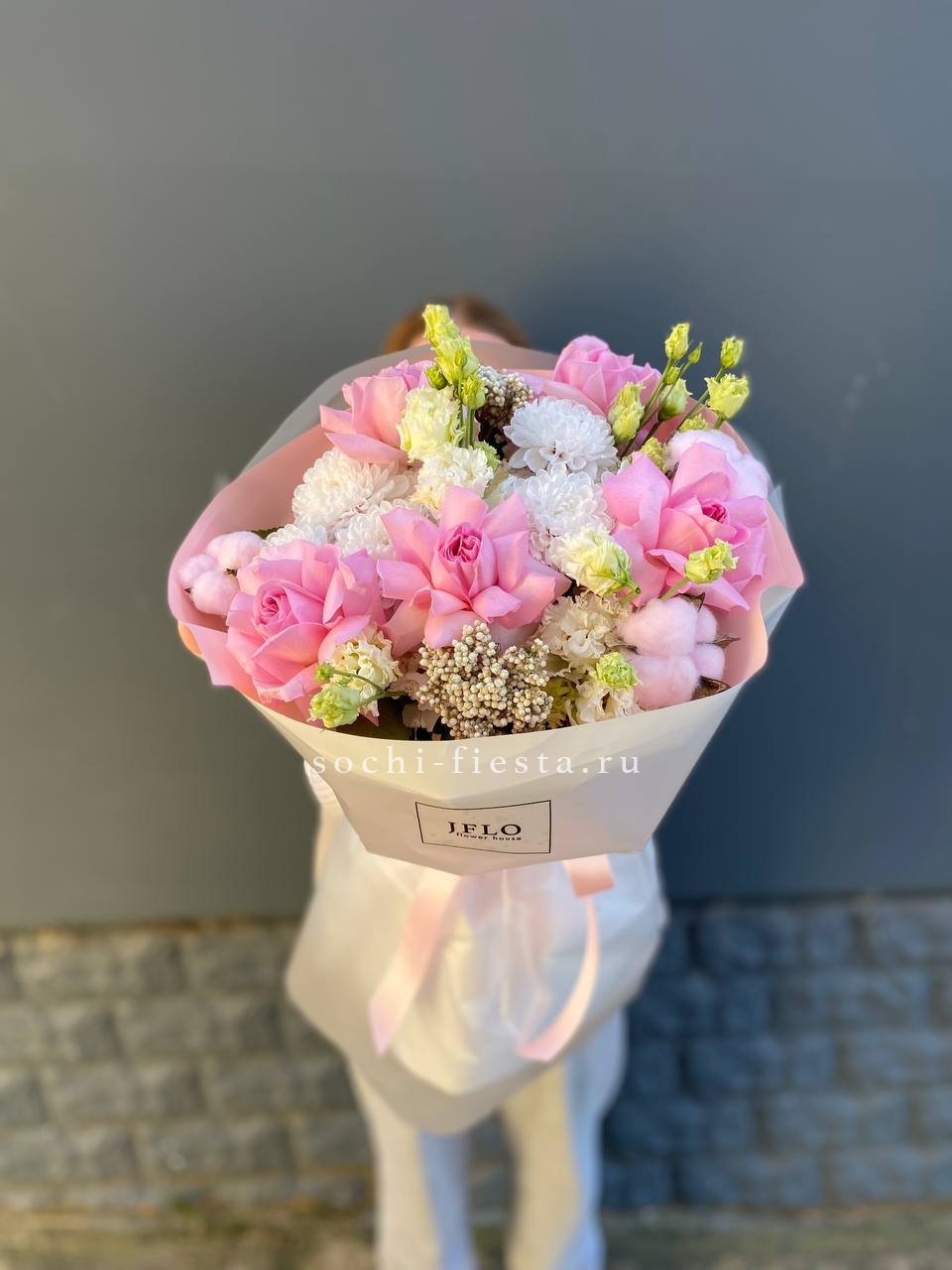 Розовые оттенки роз и эустомы переплетаются с яркой хризантемой в теплой композиции. Хлопок добавляет текстурной мягкости, а озотамус создает ажурную основу. Букет дарит радостное настроение и естественную красоту.