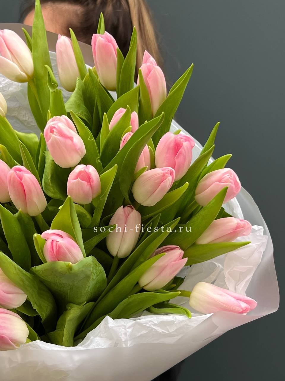 Пышная охапка из полусотни тюльпанов создает объемное облако цвета. Бутоны собраны плотно, образуя живую скульптуру с мягким розовым свечением. Такая композиция меняет восприятие пространства вокруг.