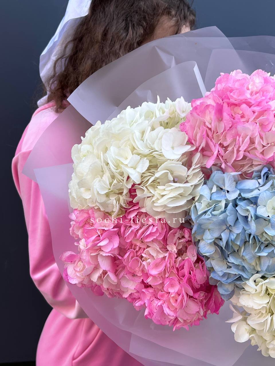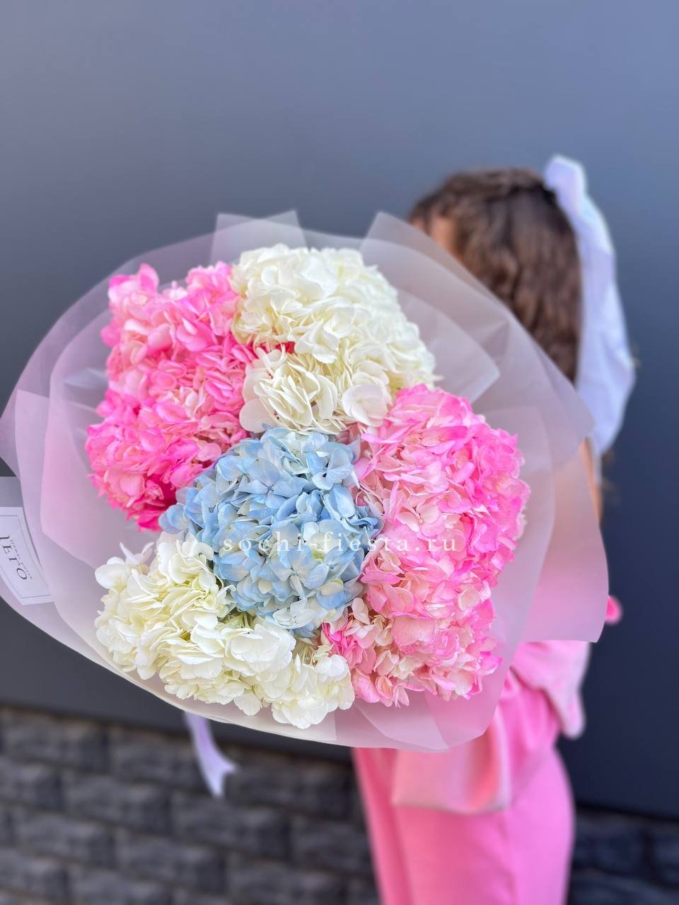 Розы и гортензия формируют объемную текстуру, где каждый бутон раскрыт по-своему. Эустома заполняет пространство между крупными соцветиями, а эвкалипт обрамляет композицию мягкой зеленой волной.