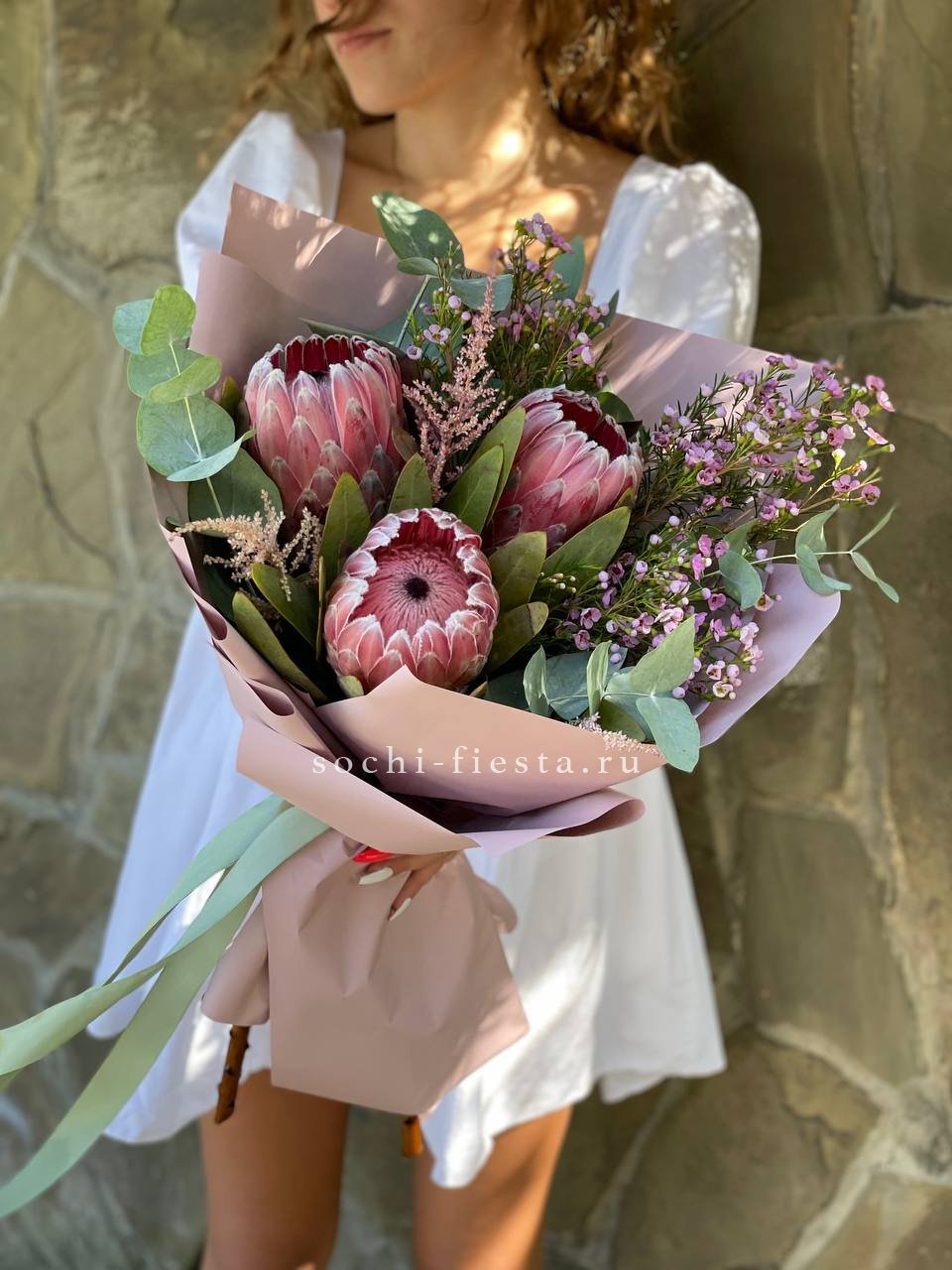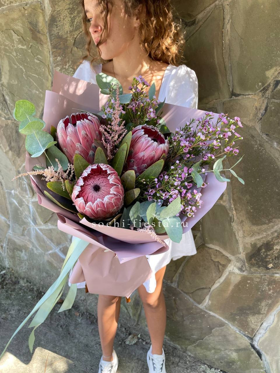 протея 3 шт., декоративная зелень в зависимости от сезона, дизайнерская упаковка.