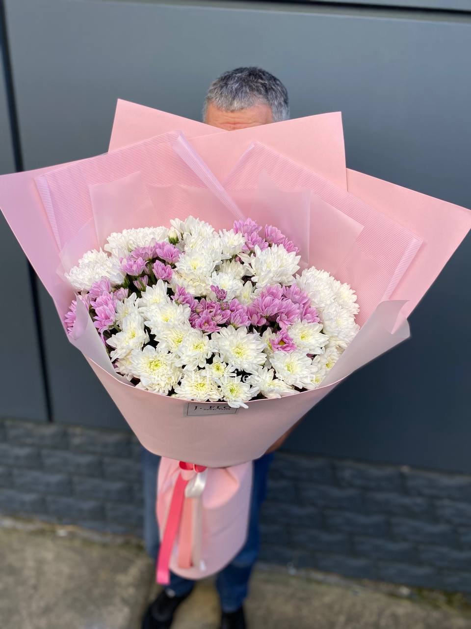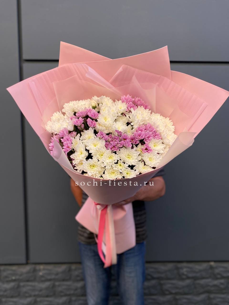 Семь пышных хризантем с коробочками хлопка собраны в мягкую композицию пастельных оттенков. Воздушная сборка и естественные линии создают ощущение легкости. Букет для тихих встреч и теплых слов.
