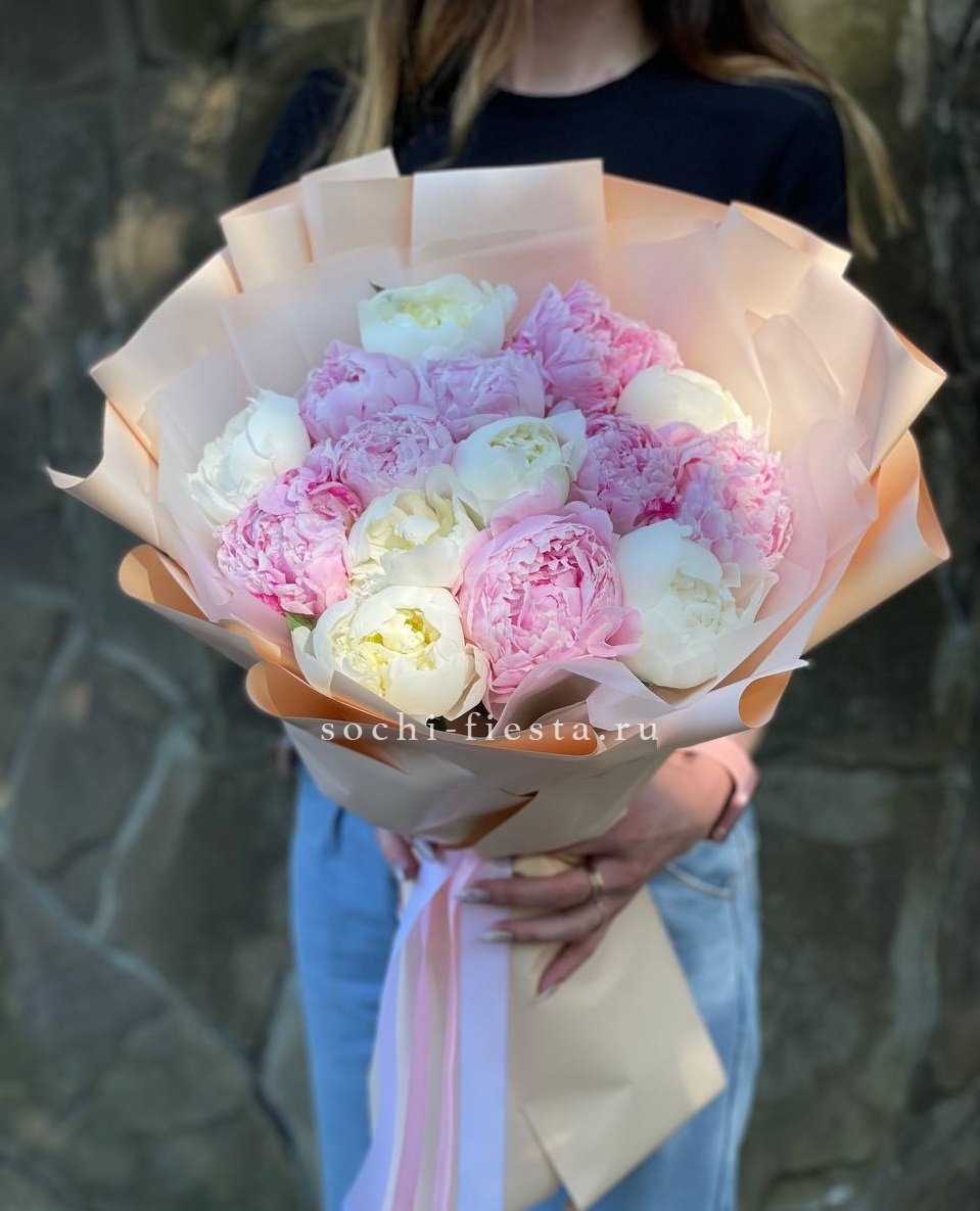 Пятнадцать пионов с пышными бутонами образуют объёмную композицию в воздушной упаковке. Каждый цветок раскрывается слоями, создавая ощущение лёгкости и наполненности одновременно.
