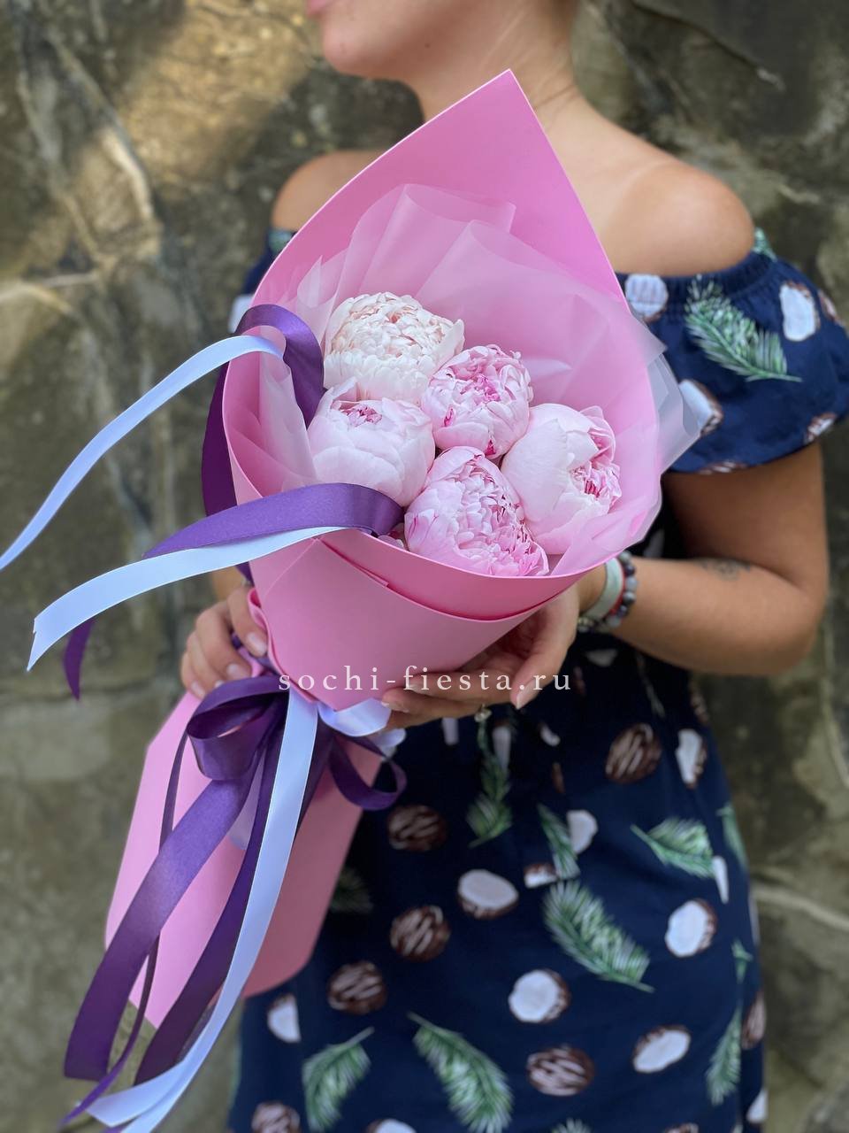 Пионы Сара Бернар в мягкой упаковке из тишью и фоамирана. Бутоны разной степени раскрытия создают живую динамику и объём композиции.