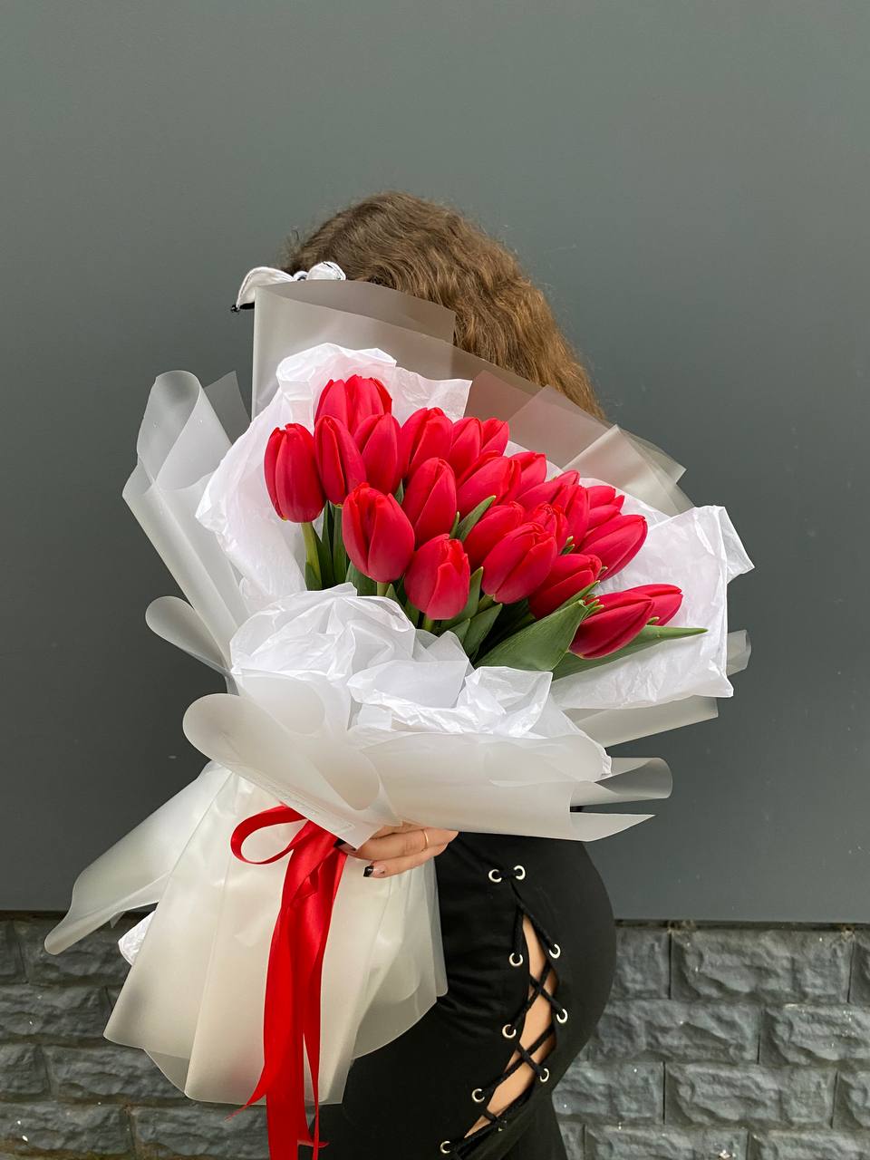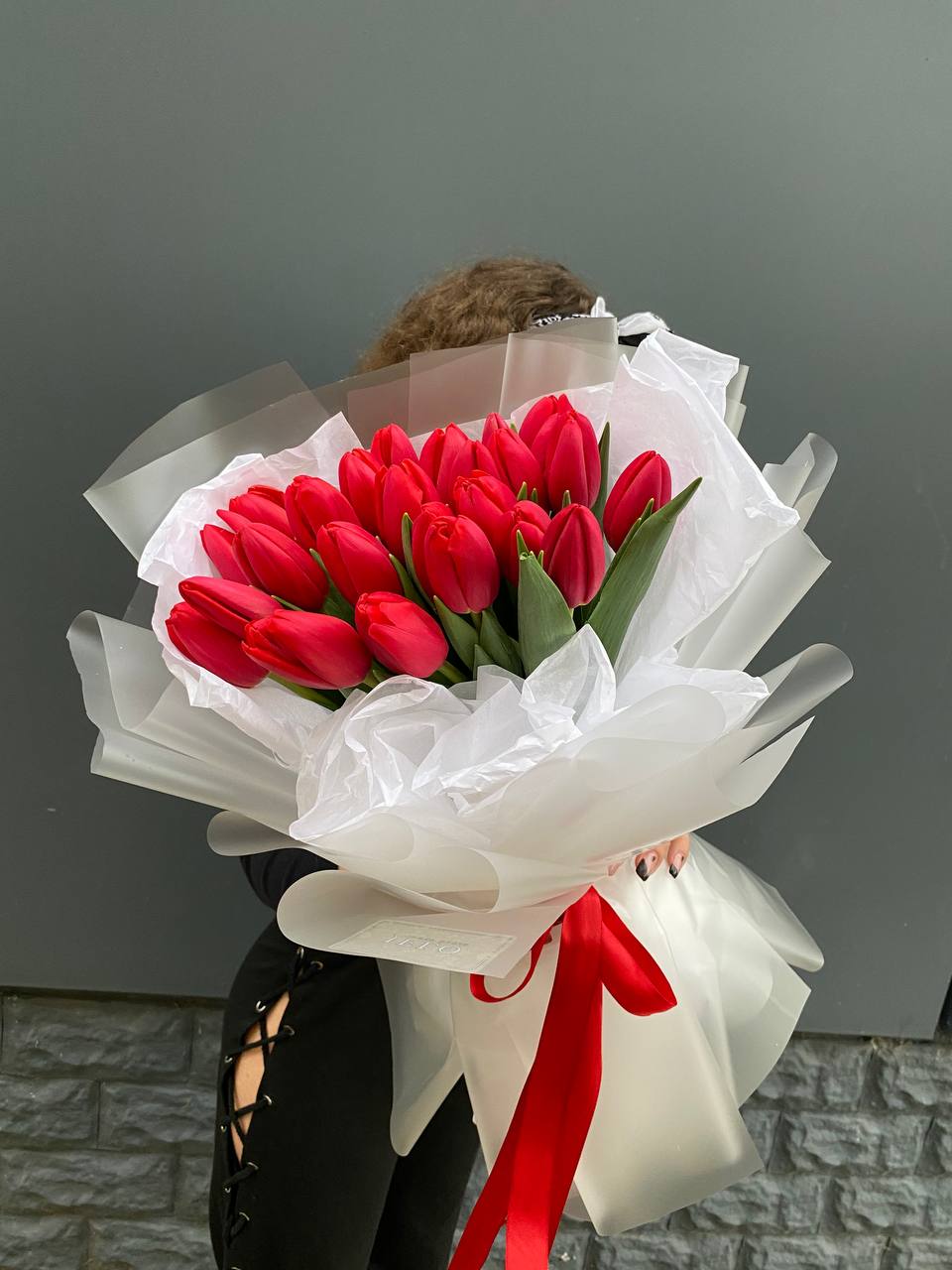 25 тюльпанов, лента, комбинированное оформление.