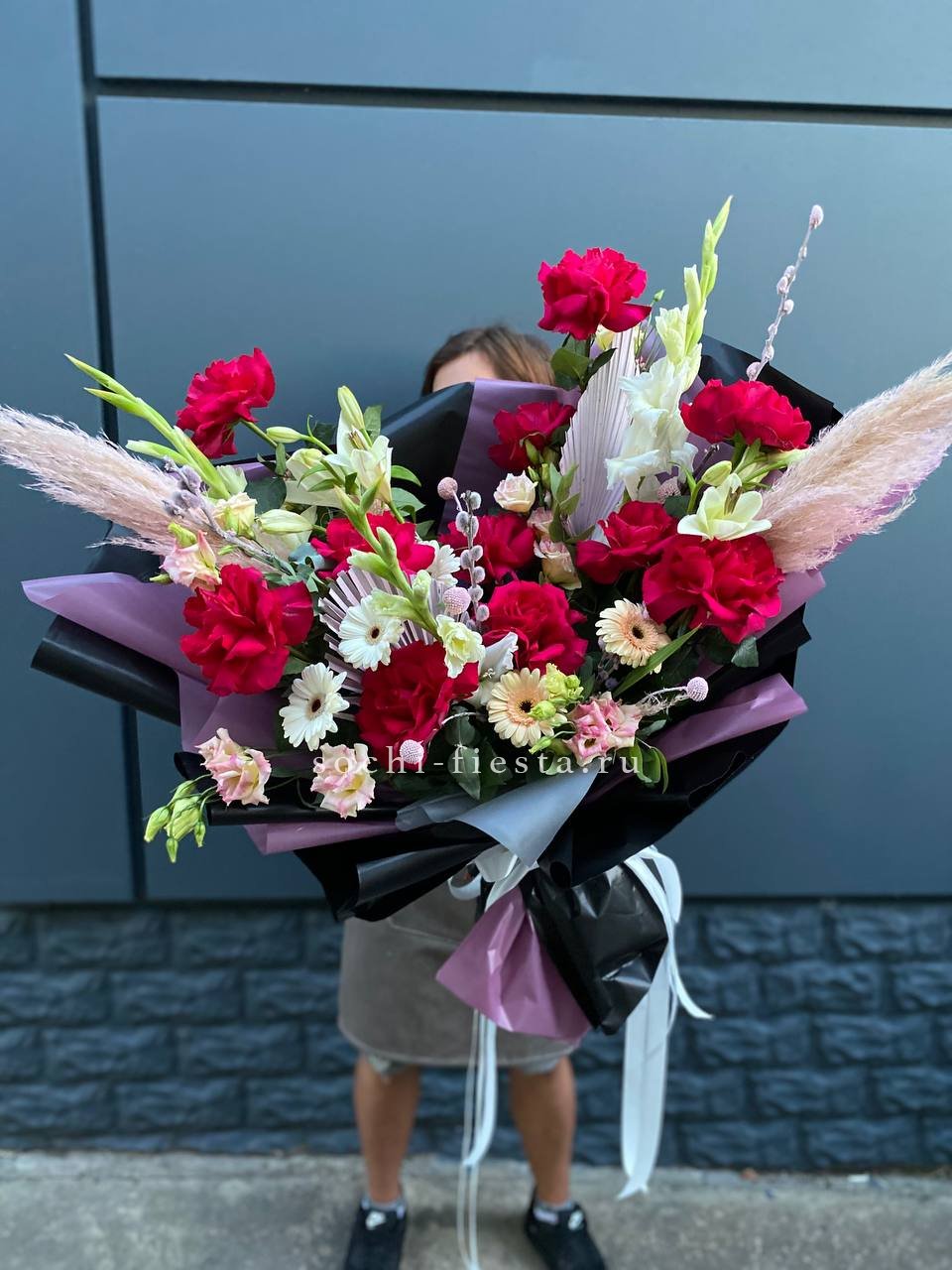 розы, герберы, эустомы, лилии, гладиолус (замена в несезон), пампасная трава, эвкалипт, упаковка, лента.