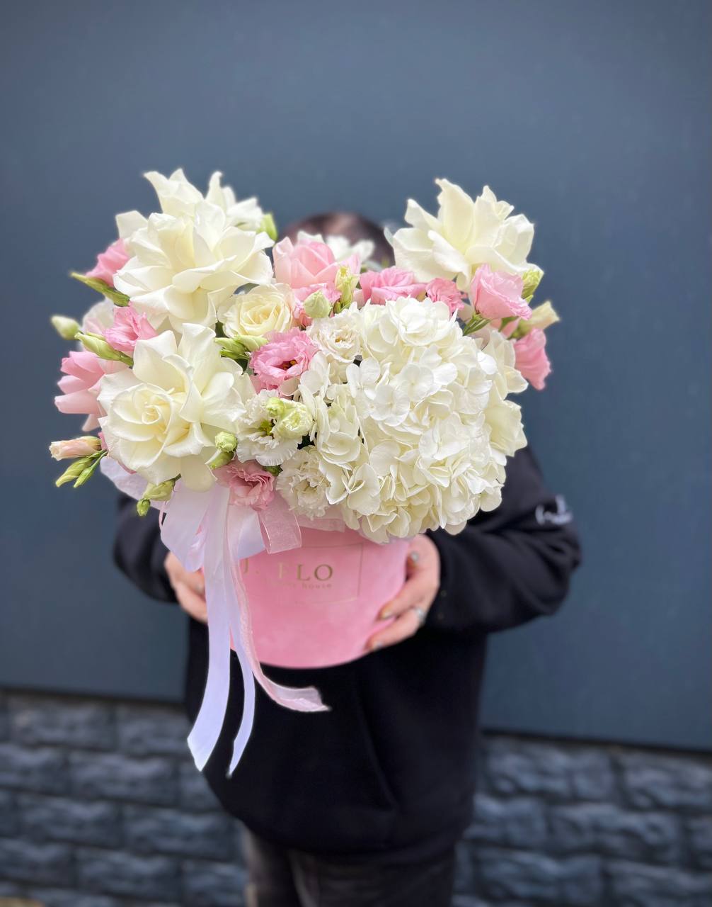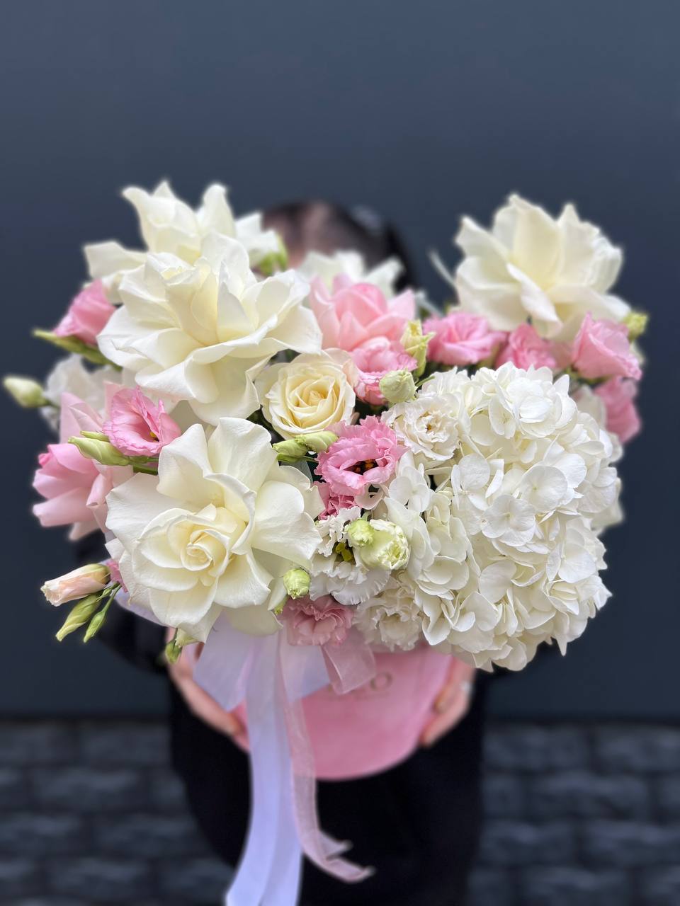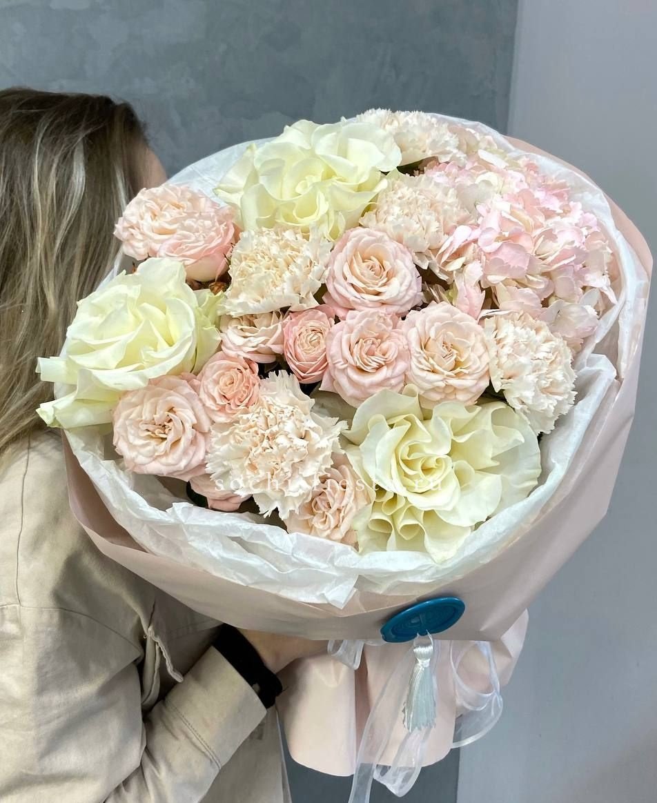 Сочетание вывернутых роз с гортензией, диантусами, розами, бомбастиками создает воздушных элегантный образ идеального цветочного подарка