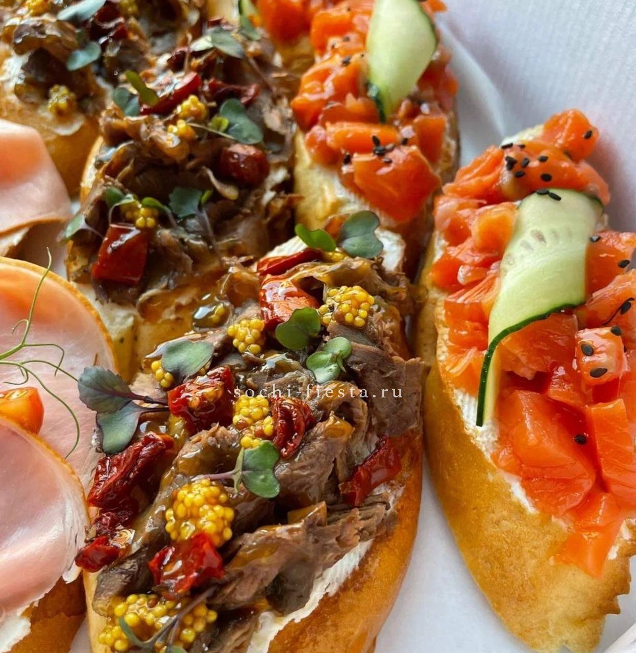 мит боллы- 12 шт. Сырные вафли- 6 шт. Овощная и фруктовая корзинки. Сосиски в тесте- 6 шт. Мини-оладушки- 80 шт. Улитки с ветчиной и сыром- 6 шт.