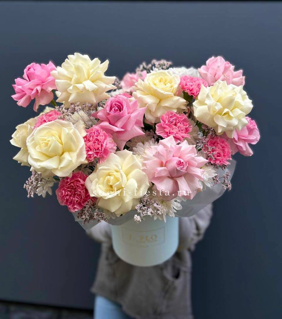 Для заказа товара "Коробка французских роз и диантусов "Бони"" с доставкой в Сыктывкаре нажмите в корзину