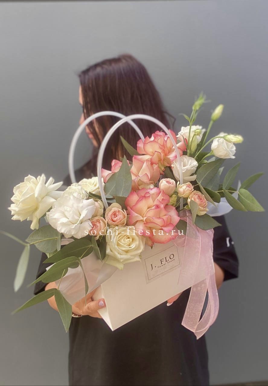 Эустомы и пионовидные розы соседствуют с французскими макарон в коробке в форме сердца. Диантусы и эвкалипт создают объём, а сладкий акцент делает композицию завершённой.