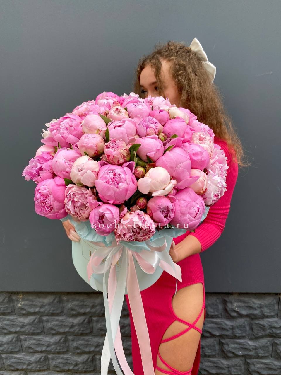 Пятьдесят один пион в одной композиции — это объём, который заполняет собой всё вокруг. Бутоны плотно уложены в цилиндр, создавая эффект цветочного облака. Такой масштаб запоминается с первого взгляда.
