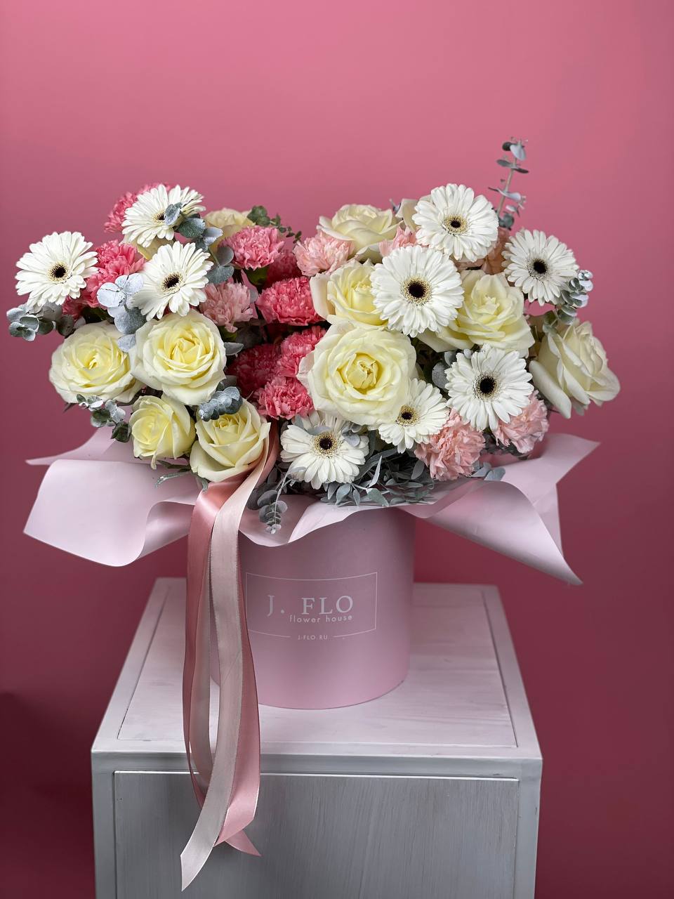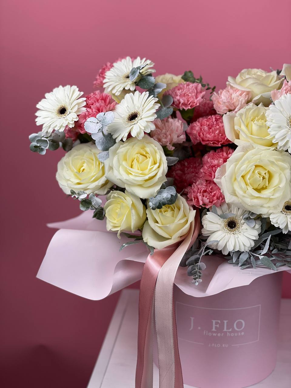 27 розовых роз в шляпной коробке с эвкалиптом.