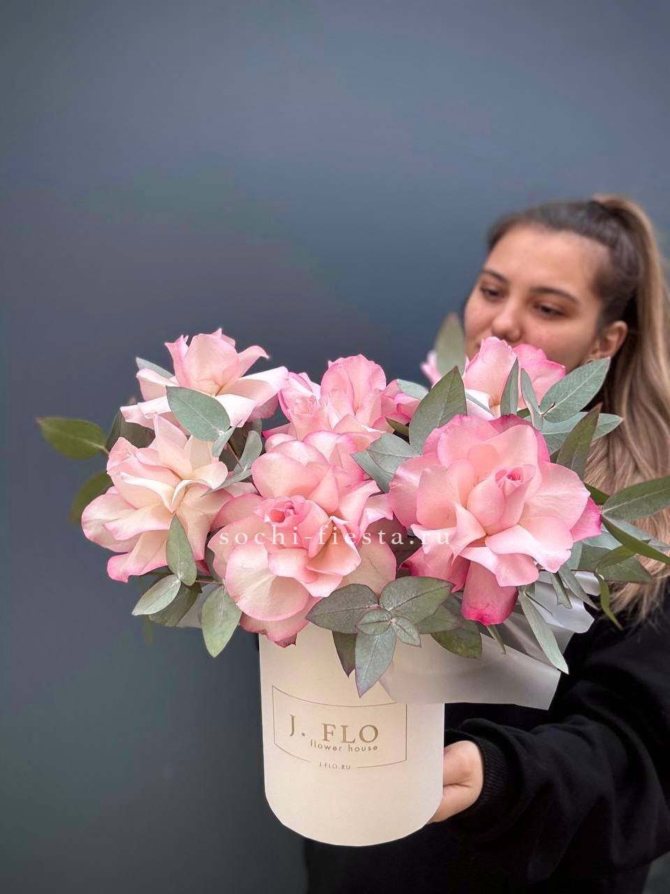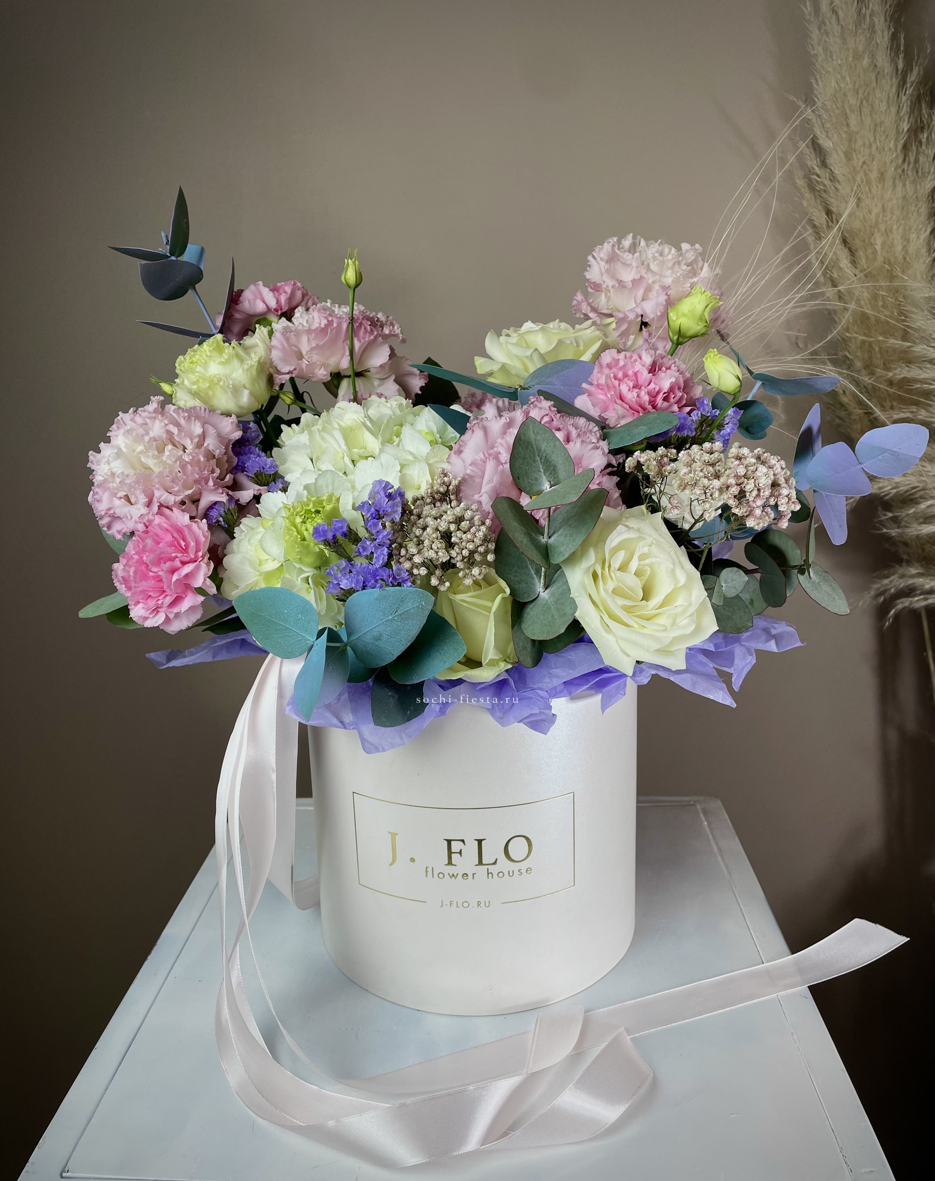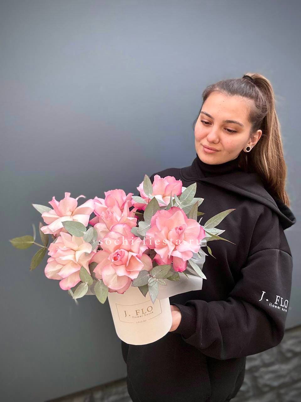Воздушная композиция в пастельной гамме с акцентом на фактуру раскрытых бутонов. Пионовидные розы и эустома создают объёмный силуэт, а хлопок добавляет графичности.