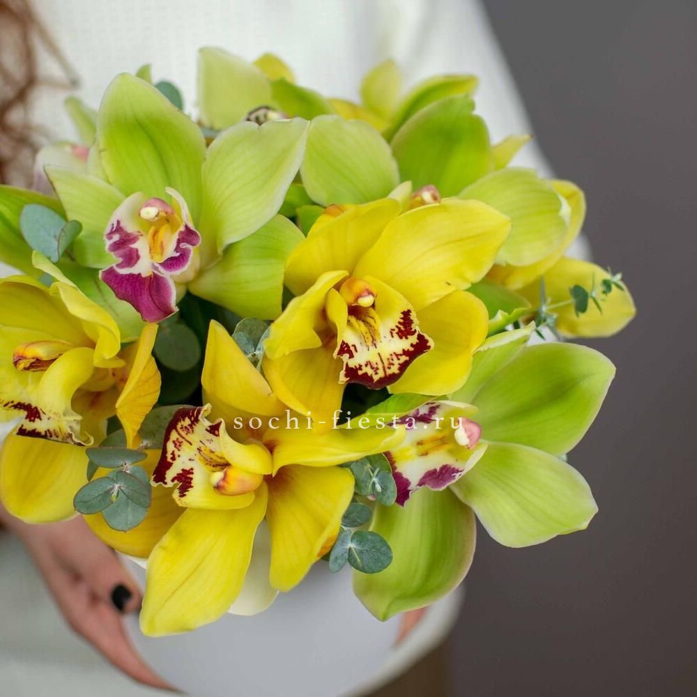 Ветка цимбидиума с крупными соцветиями размещена в круглом боксе среди декоративной зелени. Композиция выглядит графично и держит форму благодаря плотной укладке.