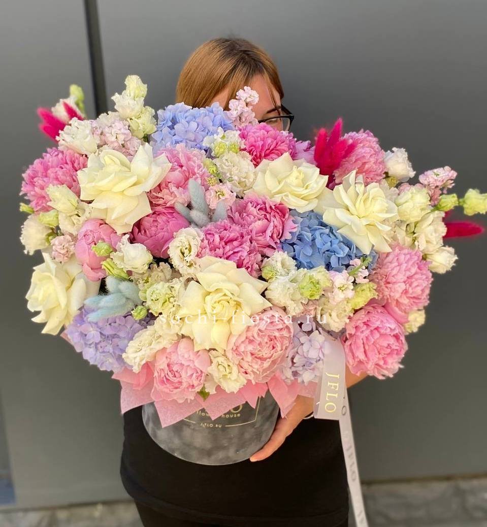 пионы, маттиола, эустома, белые розы, лента, гортензия, цилиндр D20.