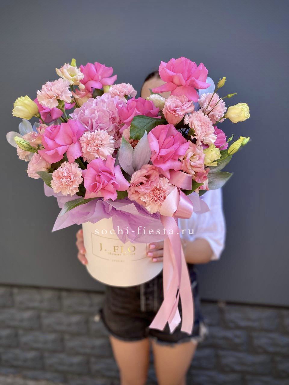 выполнен из гортензии, эустом, диантусов, французских роз, эвкалипт, цилиндр D20.