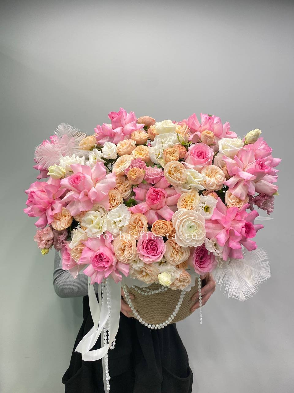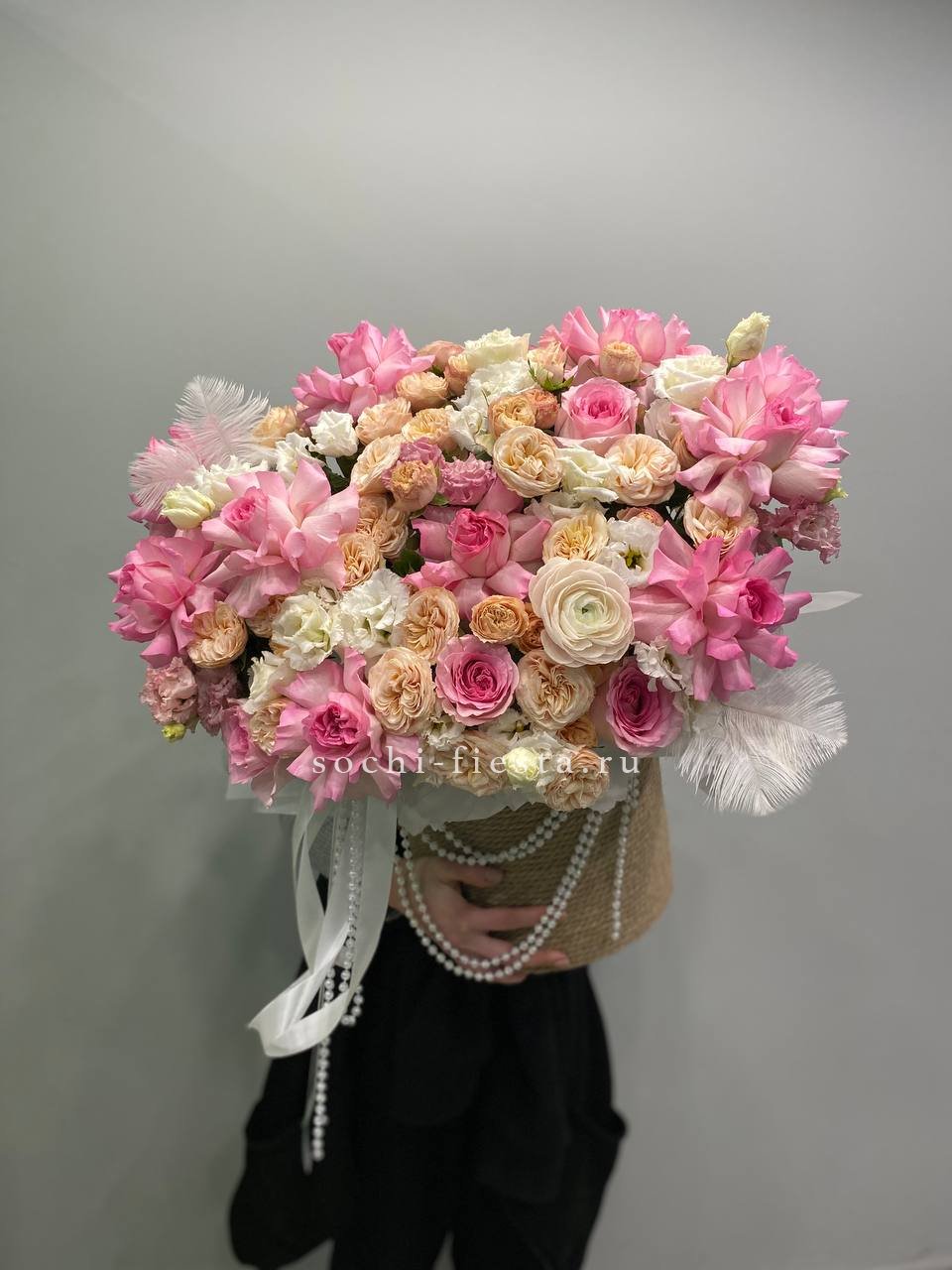 розовые розы, пионовидные кустовые, эустома, ранункулюс (возможна замена в зависимости от сезонности) в джутовом кашпо с элементами бус и перьев.