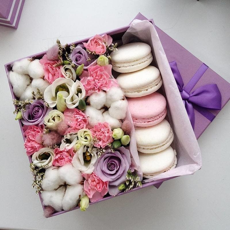 Пышная композиция в круглой коробке сочетает бутоны роз и диантусы со сладким дополнением из одиннадцати макаронс. Светлая гамма и плотное наполнение создают объемное присутствие в интерьере. Формат для тех случаев когда хочется впечатлить.