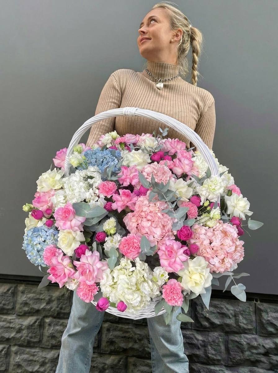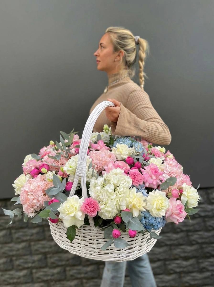 гортензии, розы одноголовые, диантусы, кустоые розы, альстромерии, эвкалипт, корзина.