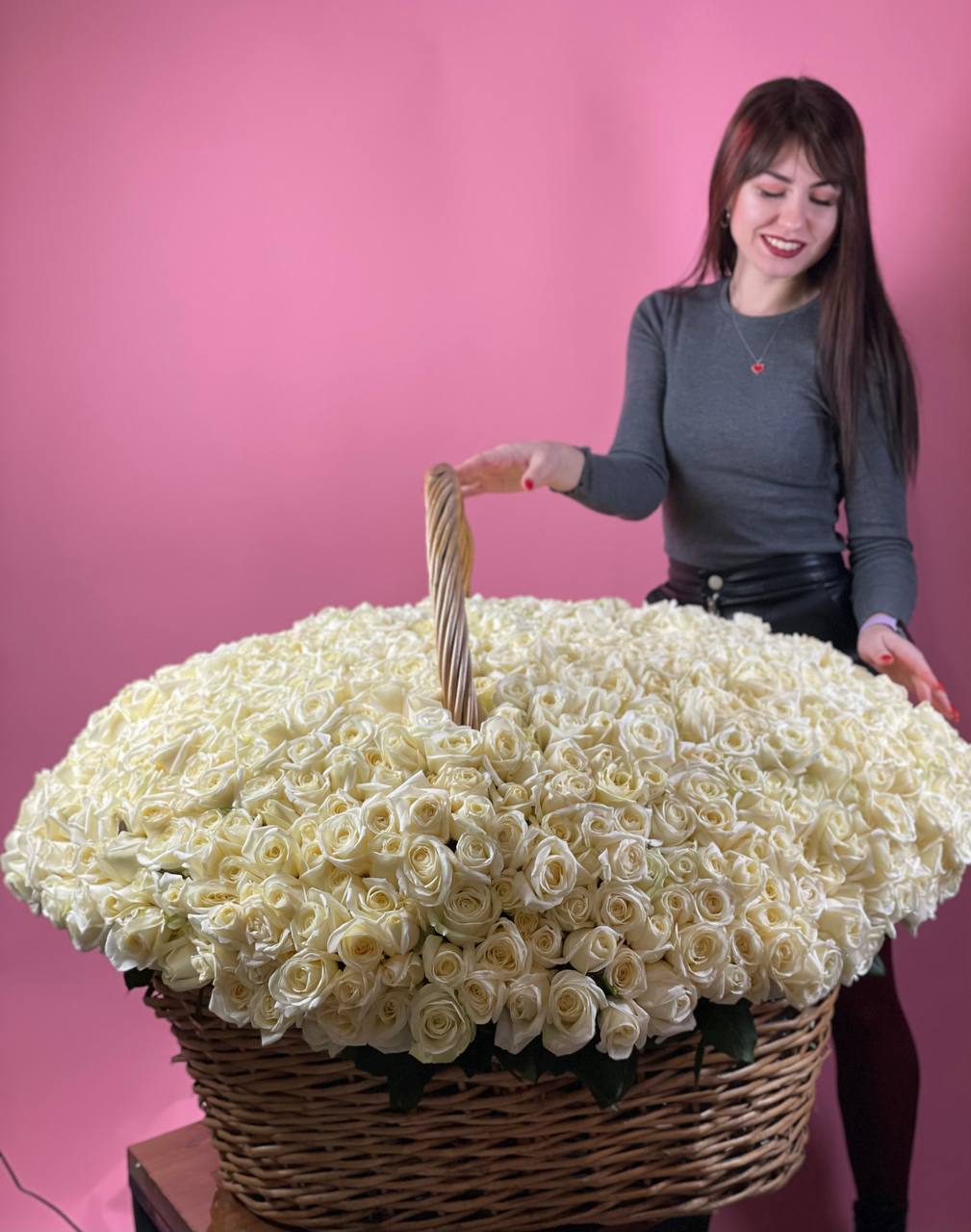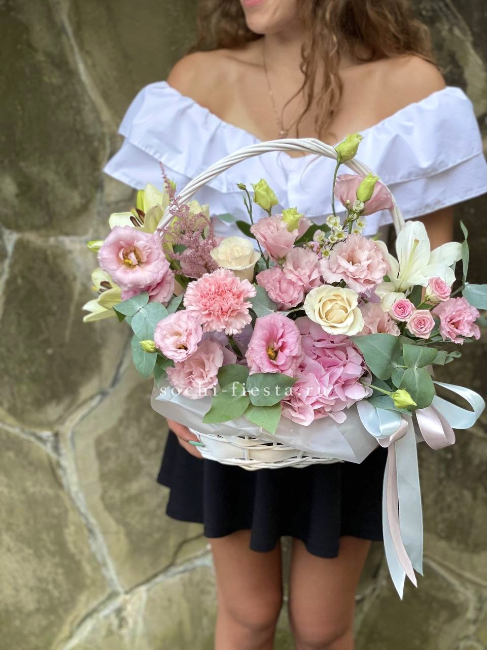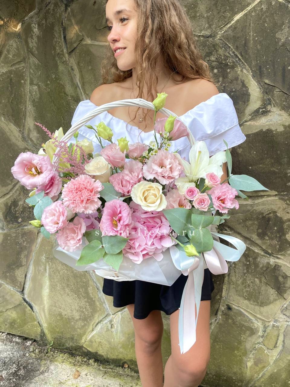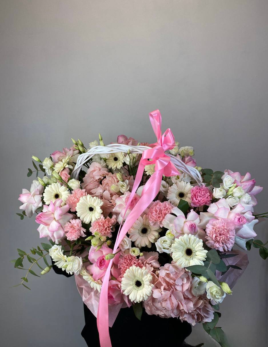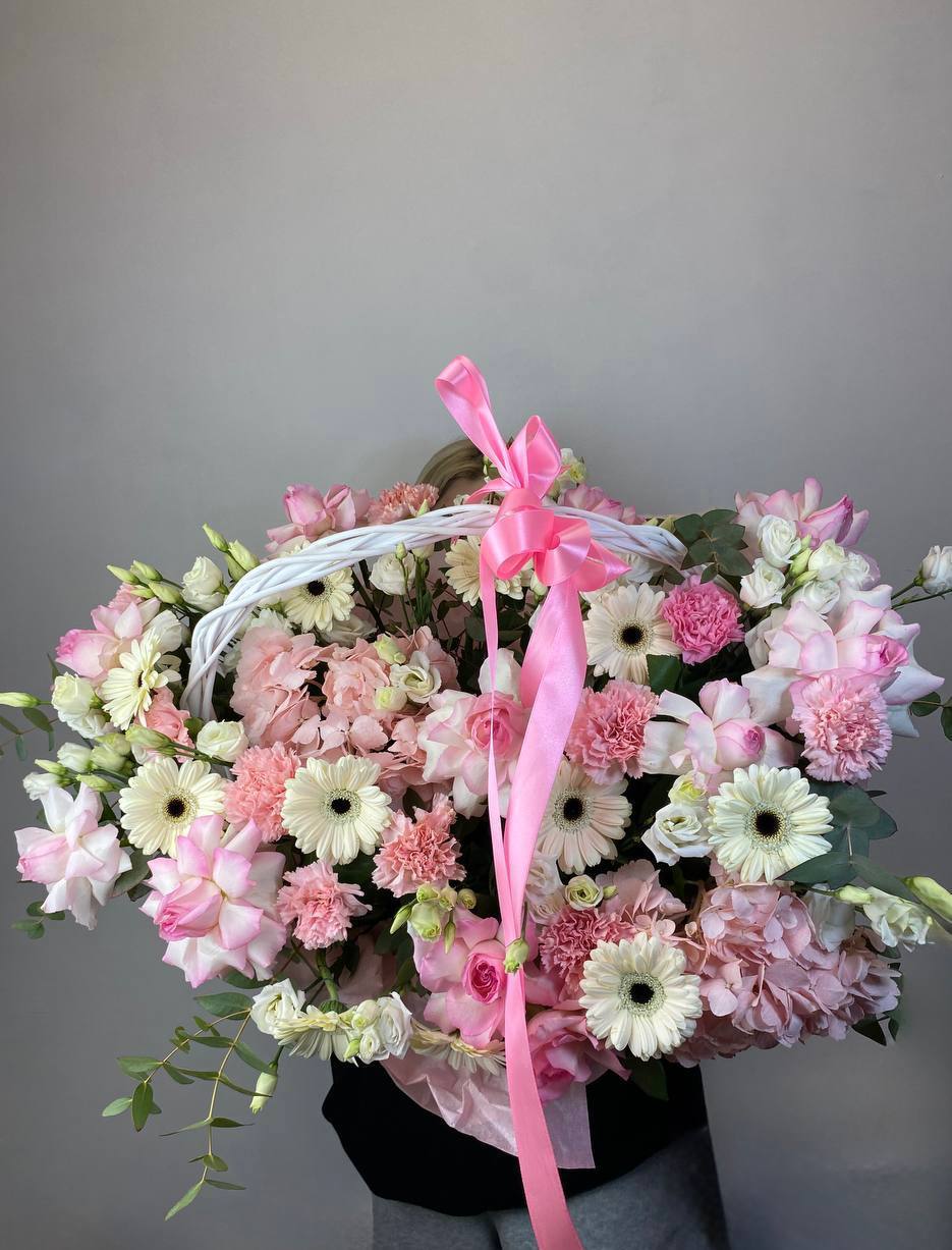 Восемь видов цветов складываются в harmonичную композицию со светлой корзиной в основе. Диантусы и эустома перекликаются с розами, а гортензия задает мягкий объем всей структуре.