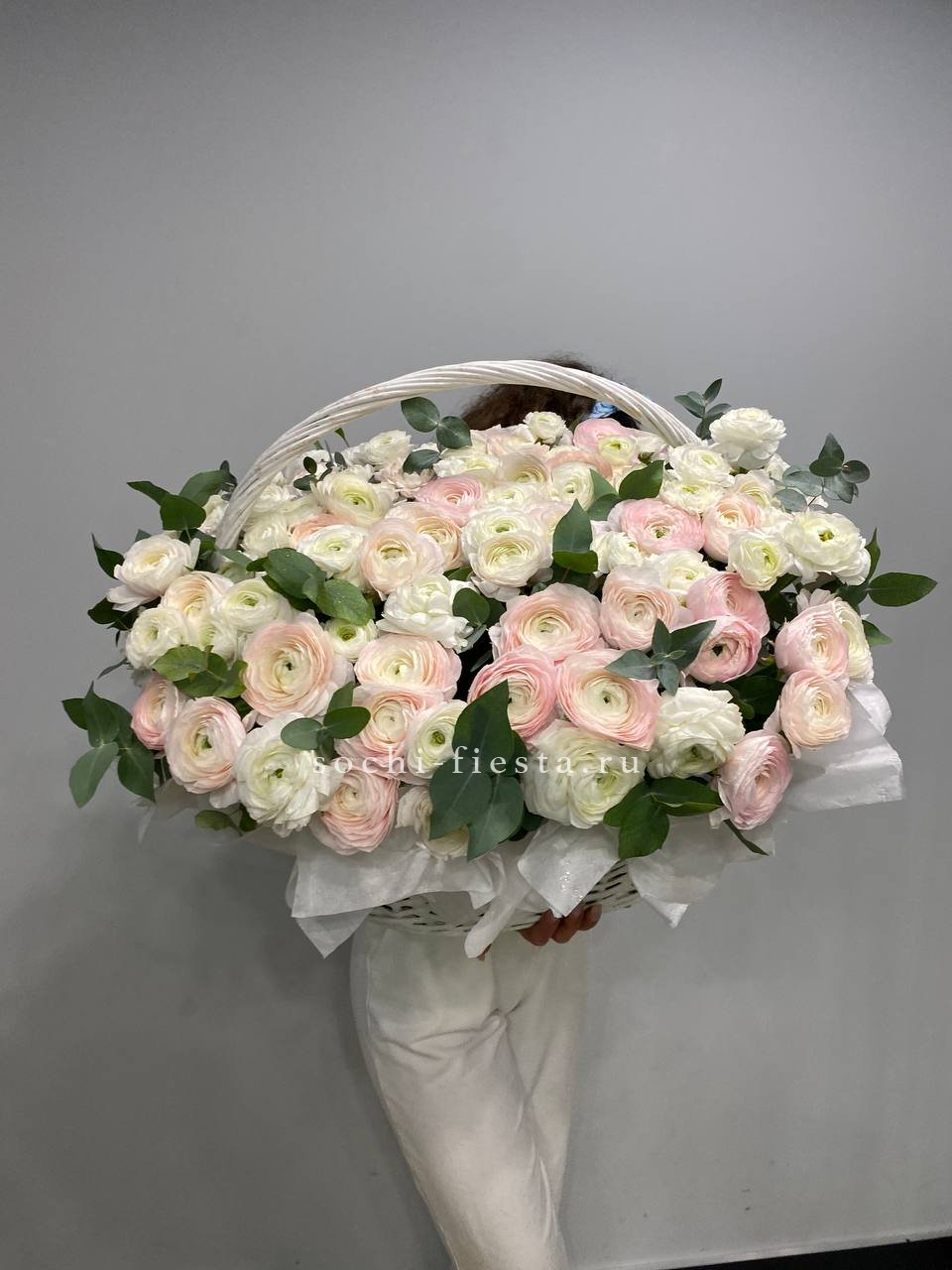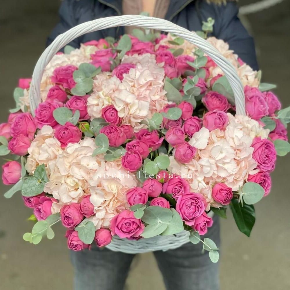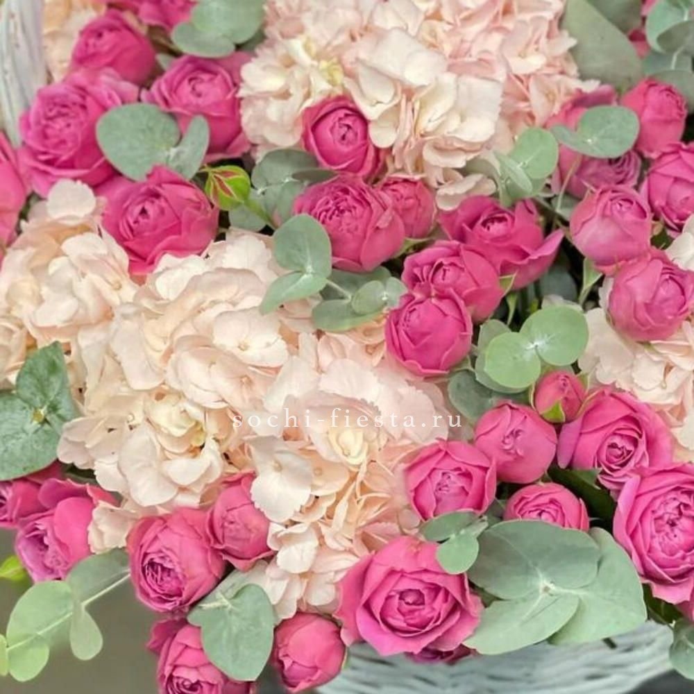 гортензия нежно-розовых оттенков, эустома, лилии, диантус, кустовая роза, эвкалипт, вспомогательная зелень, лента, светлая корзина.