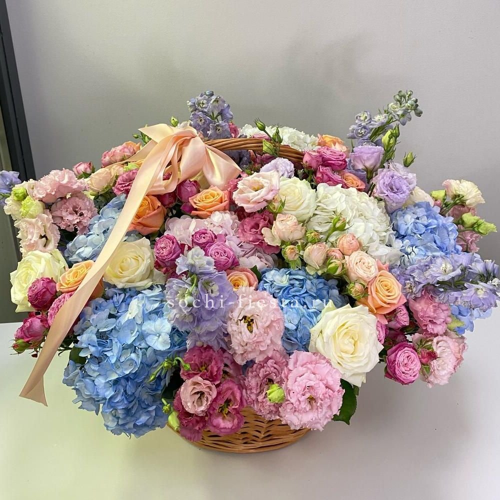 розы, эустома, гортензия, бомбастик, маттиола ( или аналог), эвкалипт, корзина.