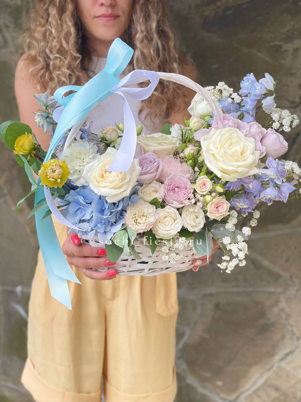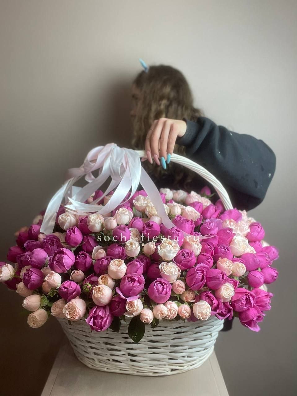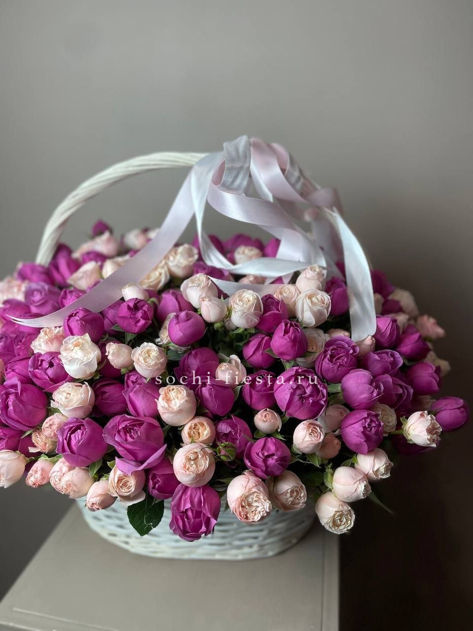 Пышная корзина с кустовыми розами и эустомой создает ощущение летнего изобилия. Диантусы добавляют воздушности между крупными бутонами, формируя объемную композицию. Готовое решение для яркого поздравления в удобной форме.