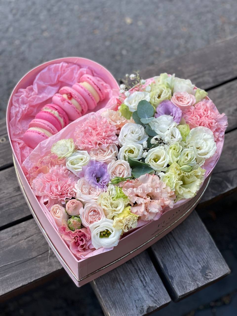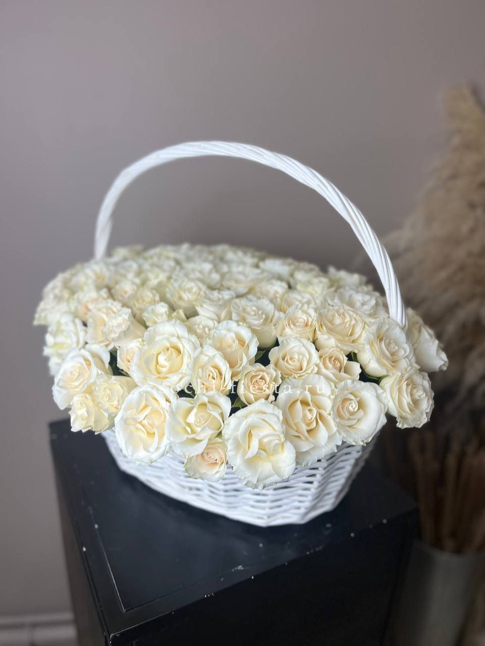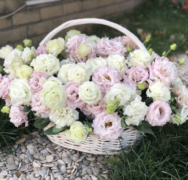 Пышная корзина объединяет пионовидные розы с воздушной гортензией и многослойной эустомой. Матиолла и лимониум добавляют глубину композиции, а диантус создает мягкие переходы между крупными бутонами.