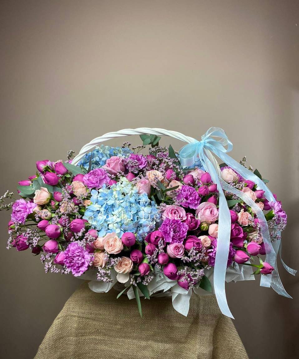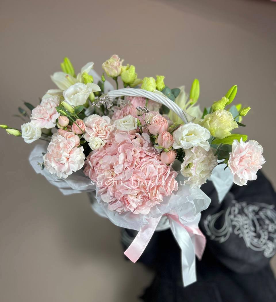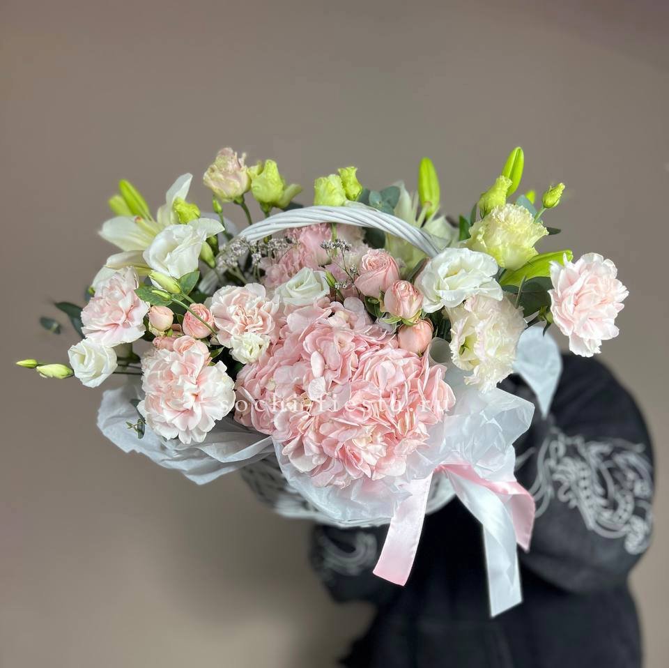 Воздушные соцветия эустомы собраны в округлую композицию с мягким переходом пастельных тонов. Светлая корзина создает легкую базу для объемной цветочной шапки.