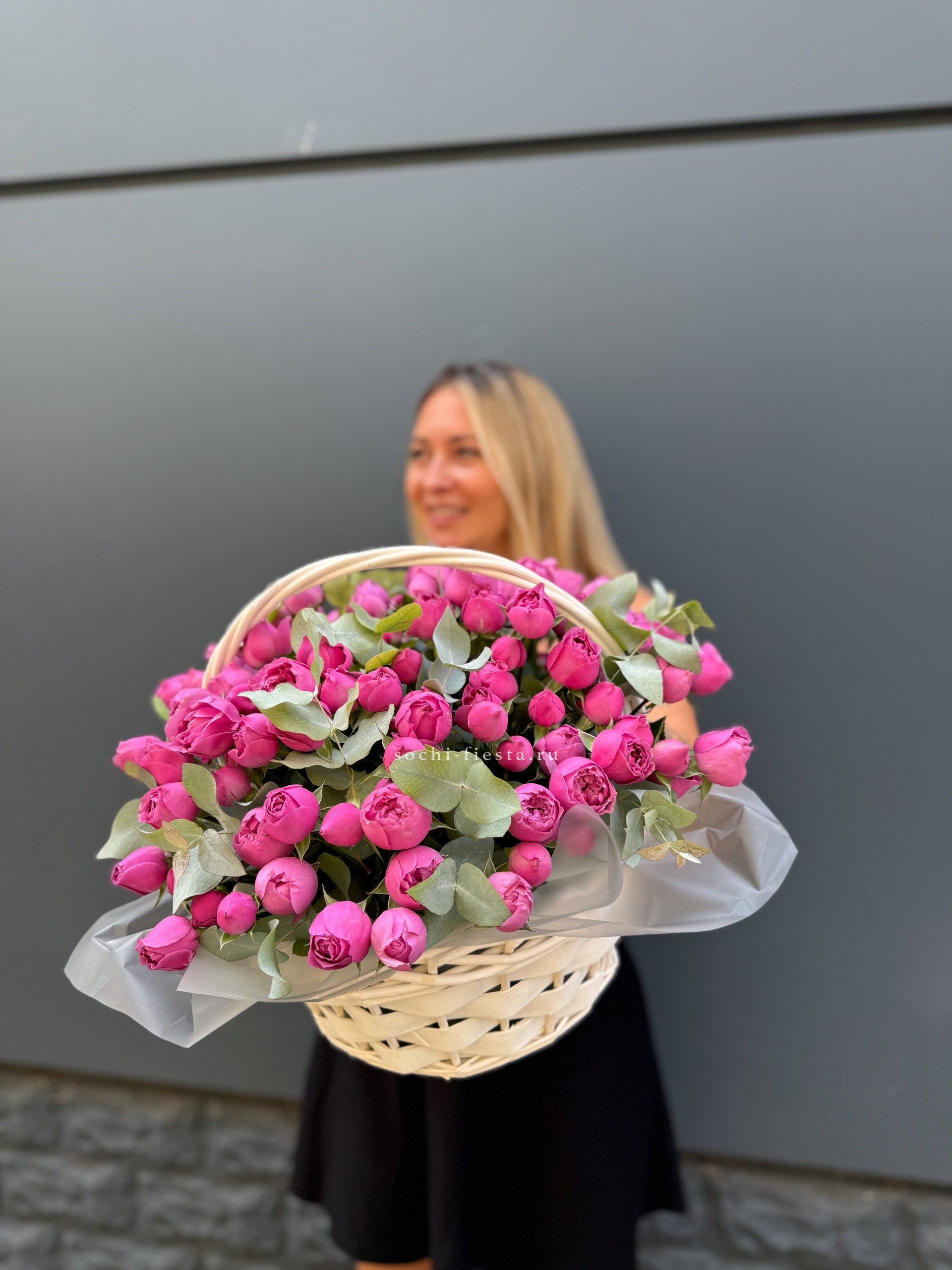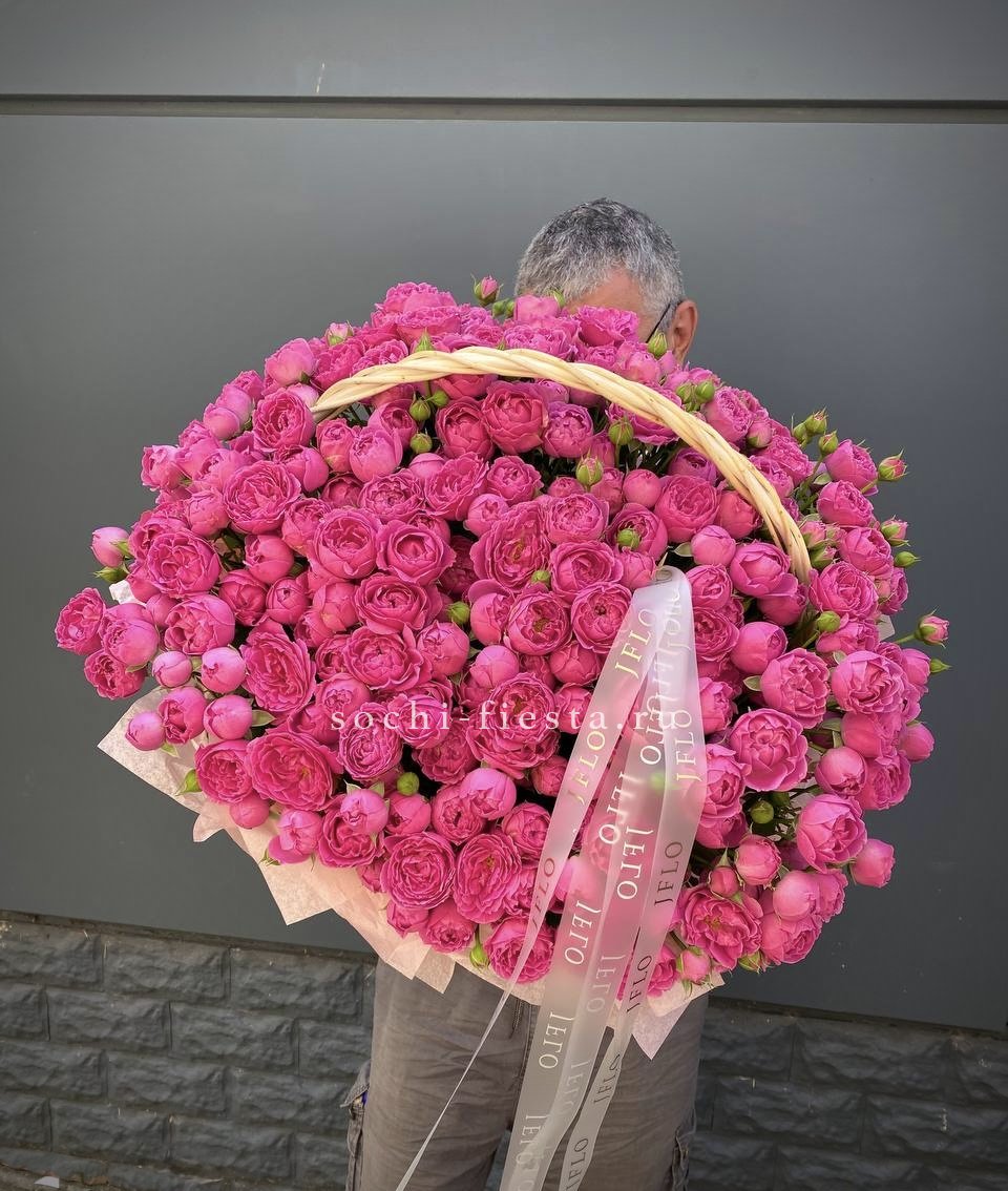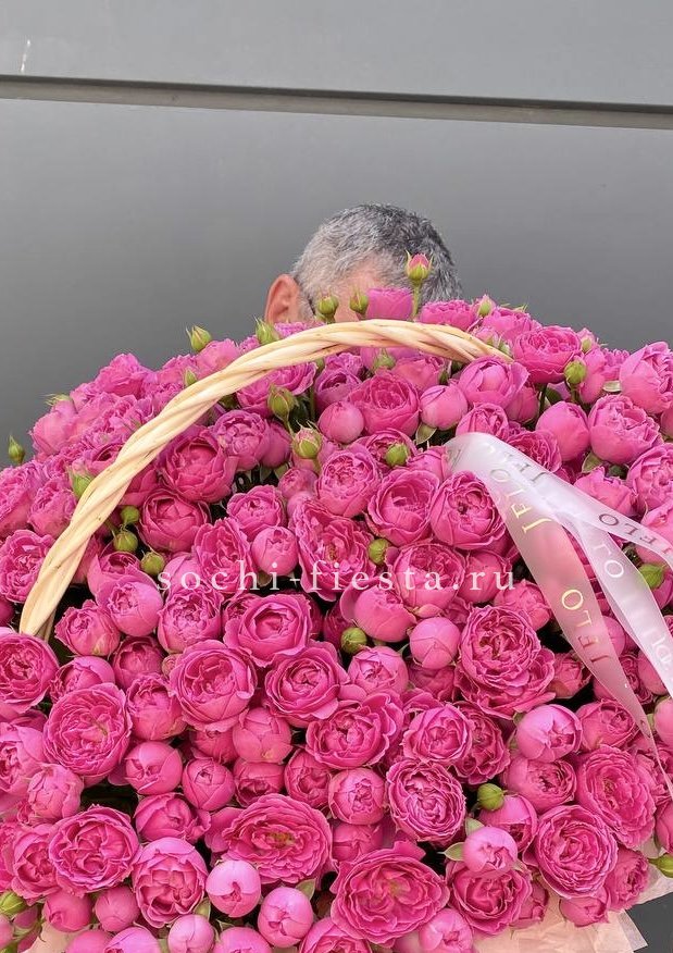 Сорок одна пионовидная роза в светлой корзине выстраивает объёмную композицию с мягкими переливами лилового и розового. Эвкалипт обрамляет густую россыпь бутонов.