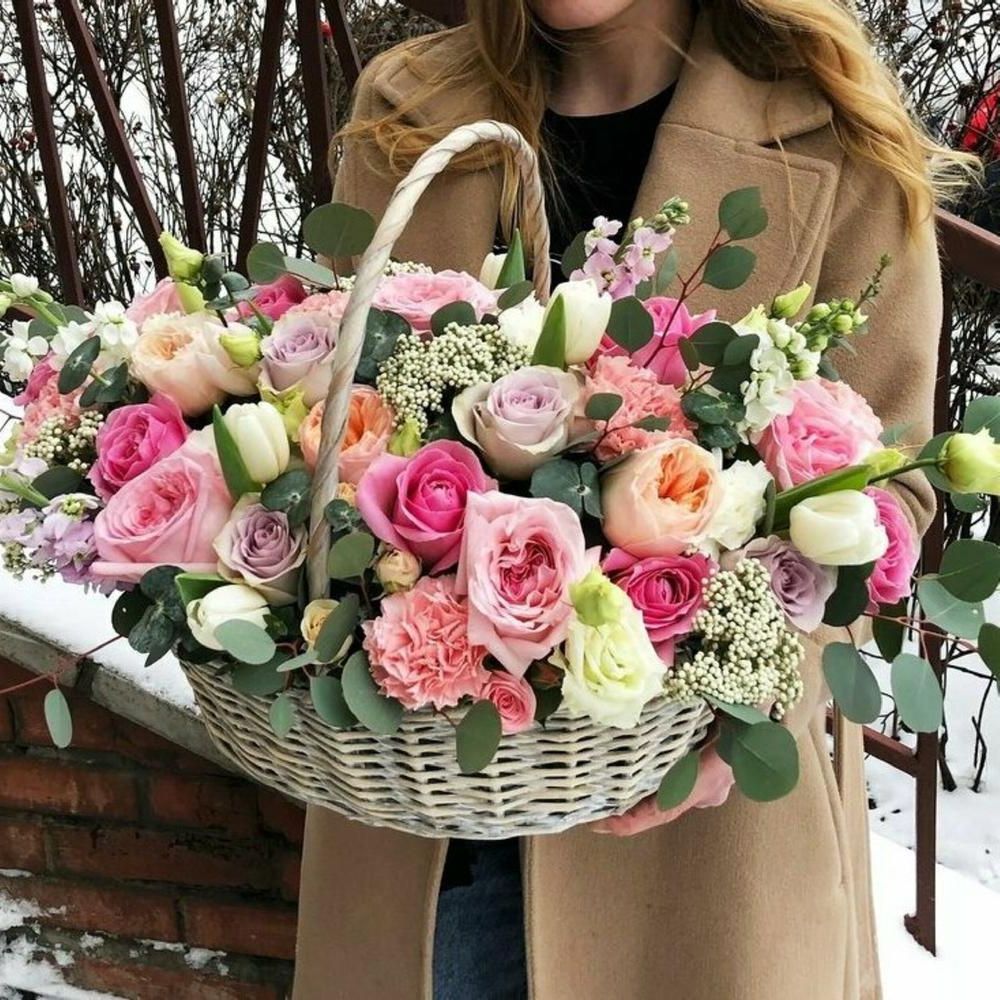 41 пионовидная кустовая роза Misty Bubbles, эвкалипт, светлая корзина.