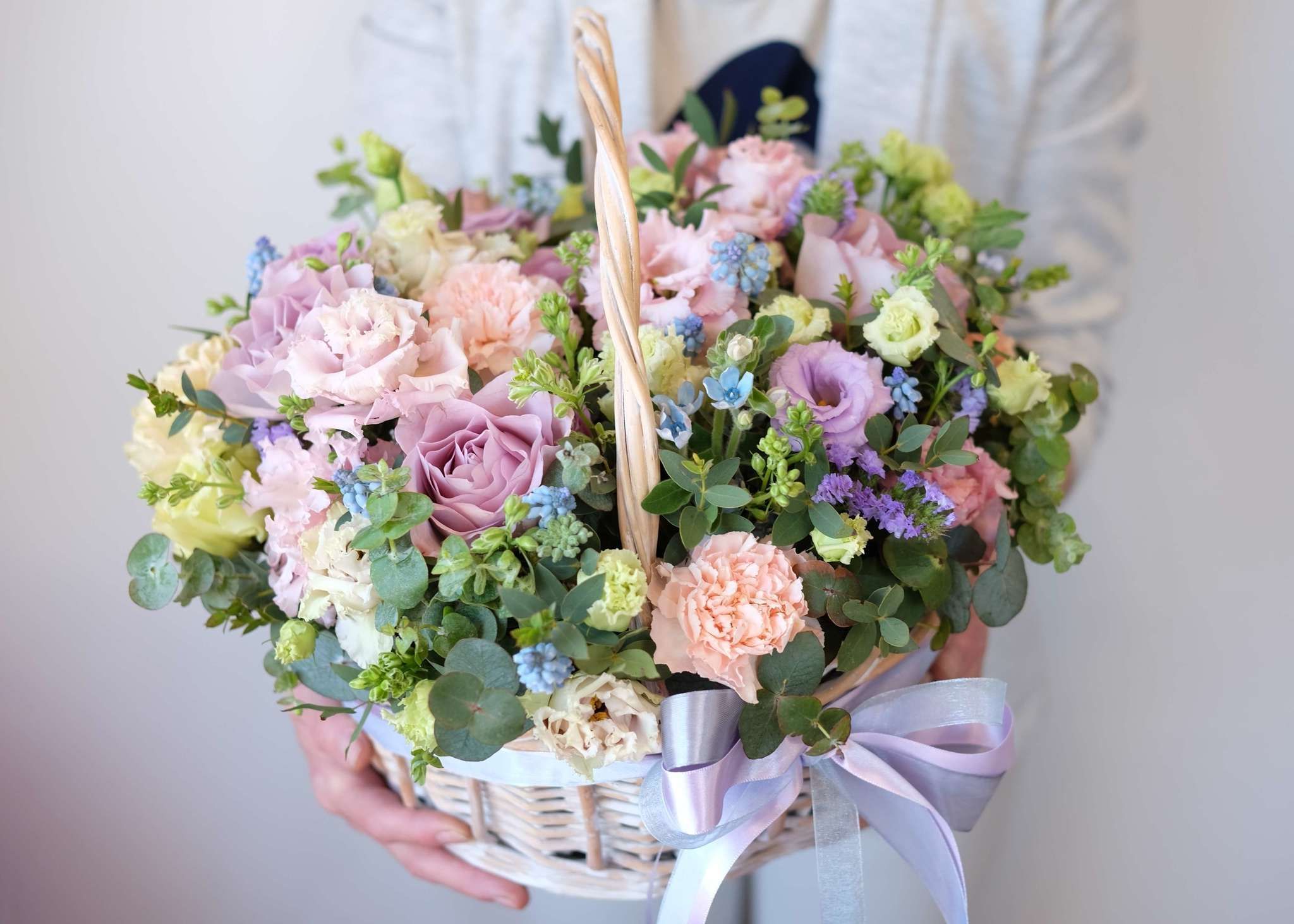 розы нежных оттенков (по возможности джумилия),эустома, диантусы,  гербера, альстромерии,  лента, корзина