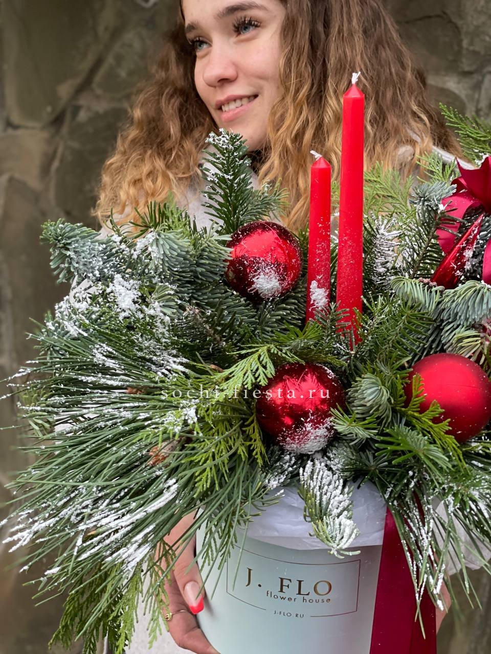 живая ель (датский нобилис), новогодние игрушки, свечи, декор, оазис, бокс D16см, ленты, тишью Готовая композиция может иметь незначительные внешние отличия от примера на фотографии.