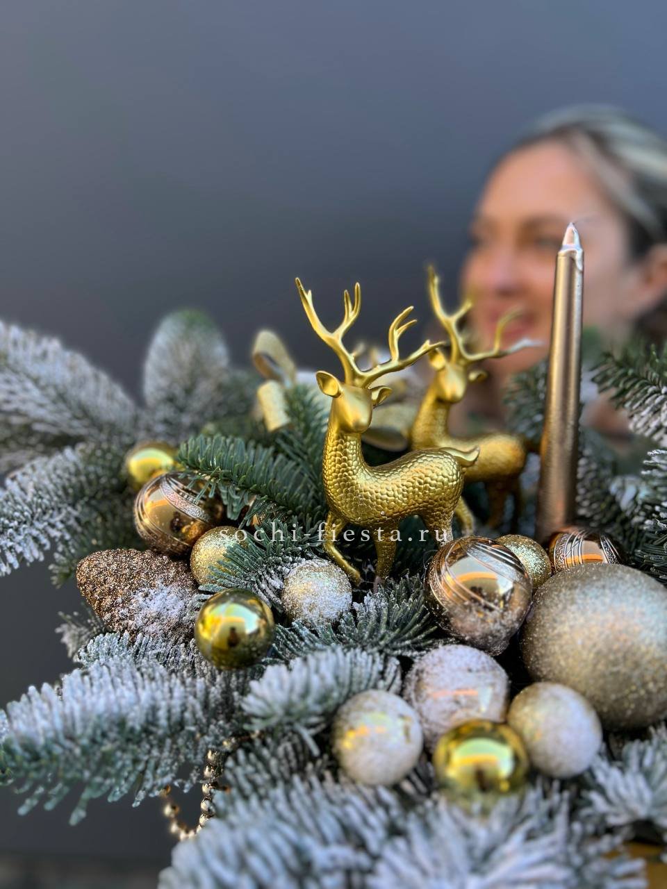 Живые ветки нобилиса образуют плотную композицию вокруг мерцающих свечей. Золотистые акценты в декоре добавляют теплоты зелени и создают камерное новогоднее настроение.