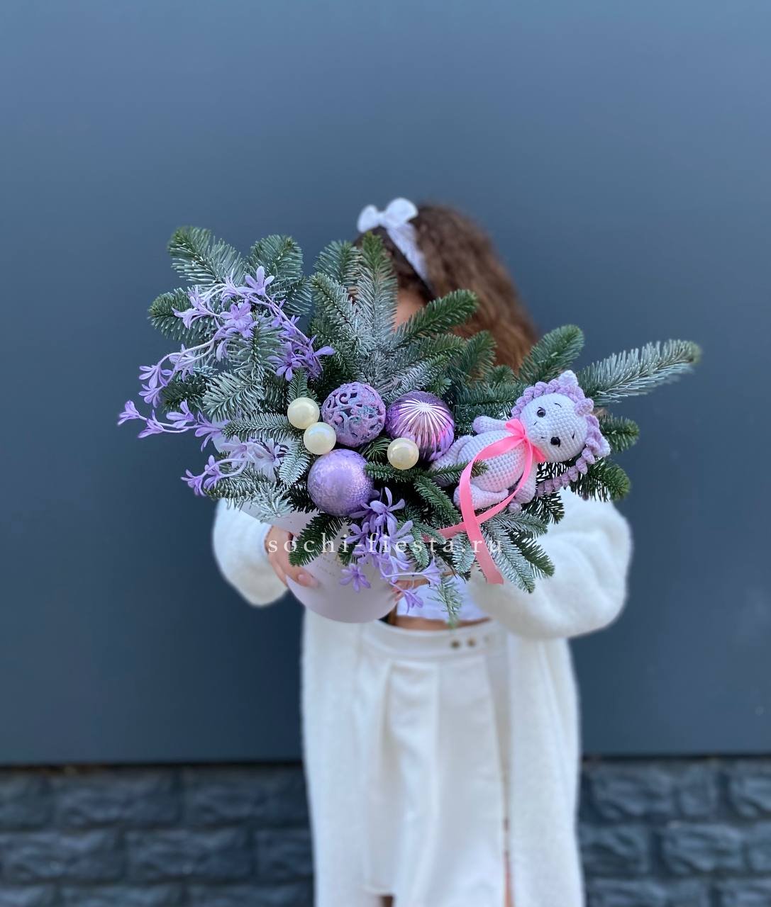Пышная зелень нобилиса обрамляет фигурку единорога и праздничные украшения. Композиция выстроена в цилиндре на флористической основе. Яркие шары добавляют цветовых акцентов между ветвями.