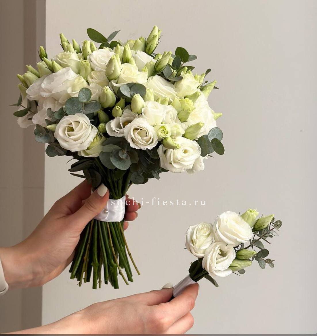 Белая эустома распускается постепенно меняя плотность от закрытых центров к волнистым краям. Веточки эвкалипта создают прохладный зеленый фон для девятнадцати цветков.