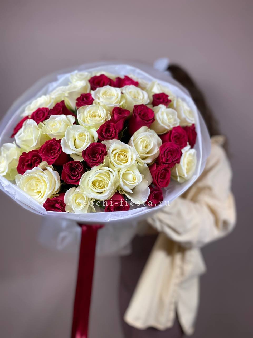 роза - 15 шт.,  фисташка или эвкалипт, лента, дизайнерская упаковка.