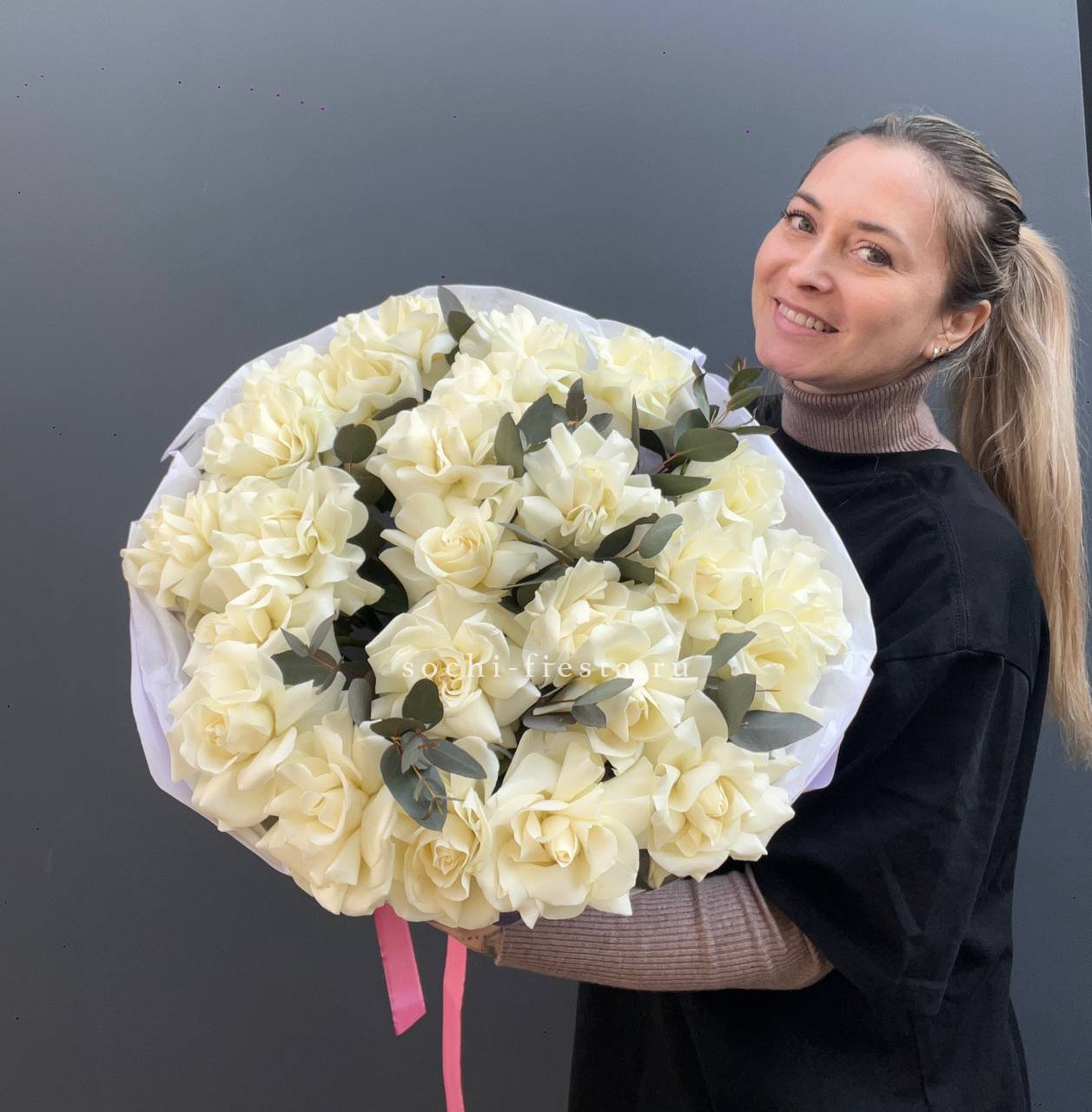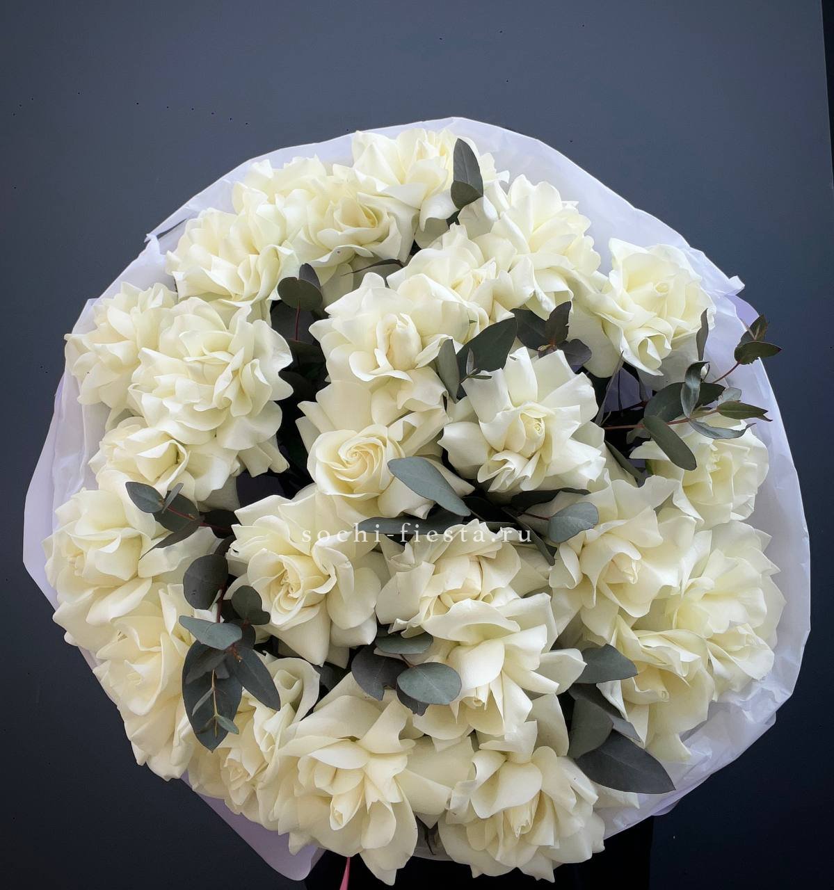 Двадцать пять вывернутых бутонов формируют объемную композицию с выразительным присутствием. Белые лепестки и зелень эвкалипта создают ощущение простора и легкости.